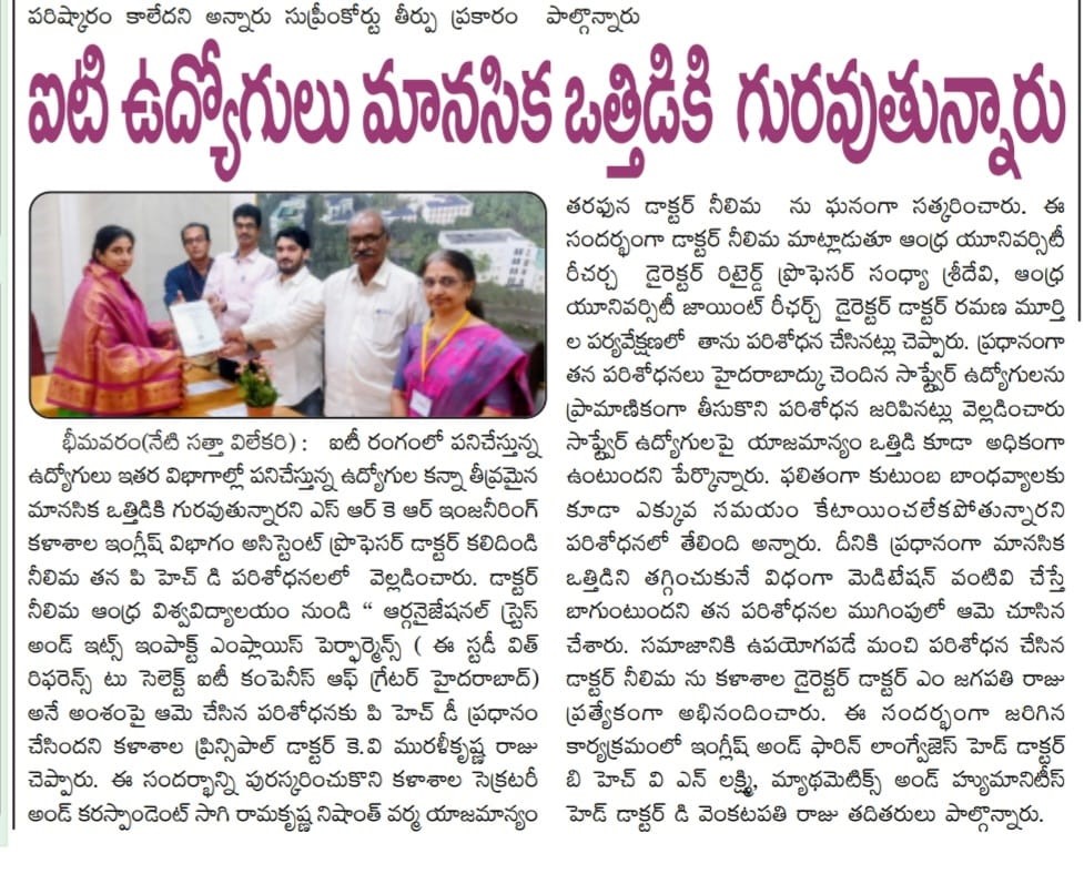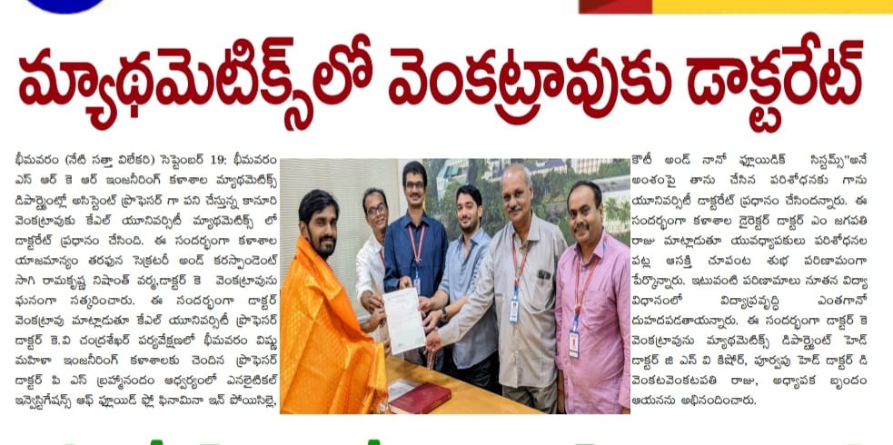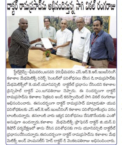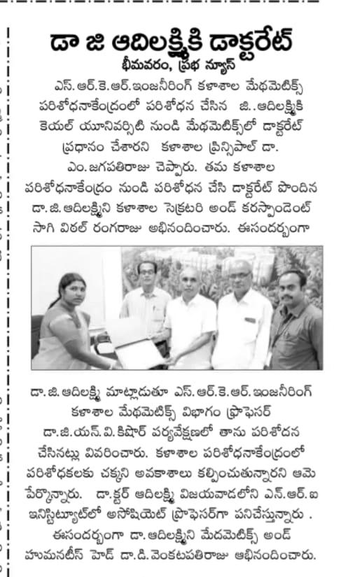 Having enough number of doctoral degree holders, the department evinces a great amount of research orientation and commitment. The department is recognized as a Research Center by JNTUK, Kakinada, considering its research potential. The faculty supervise the research for Ph.D programmes. There are 14 doctrate holders and 2 faculty members pursuing Ph.D . Nine scholars are pursuing their Ph.D. through the Research Centre of the department. The Dept. holds to its credit an Indo – Israel collaborative research project and three more projects through the Center for Research and Development (CRD) of the institution. The Dept. is flourishing with an objective of providing a strong mathematical application in the methods and techniques of Applied Mathematics, Statistics and Discrete Mathematical structure to the benefit of engineering students of different disciplines.