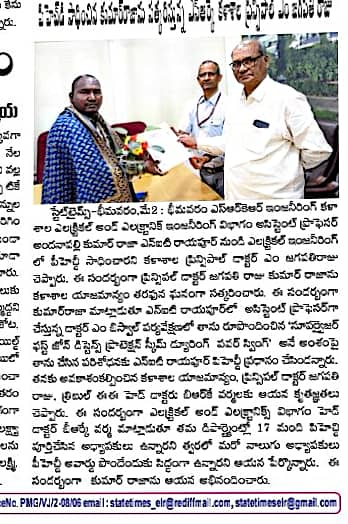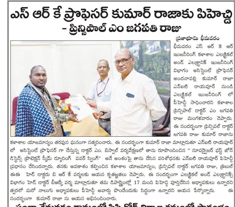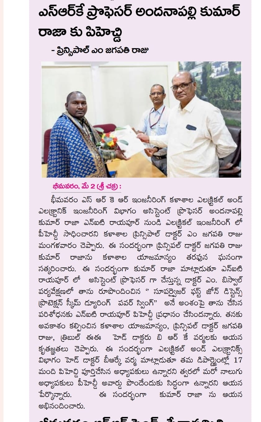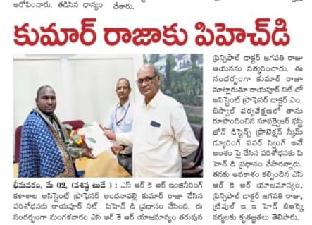 EEE Dept Assistant Professor Mr. A. Kumar Raja had received his doctorate from NIT Raipur, Principal