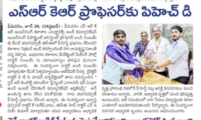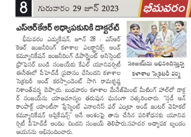 Assistant Professor of ECE Dept Mr. Bandi Sanjay had recived his Doctorate from KL University.