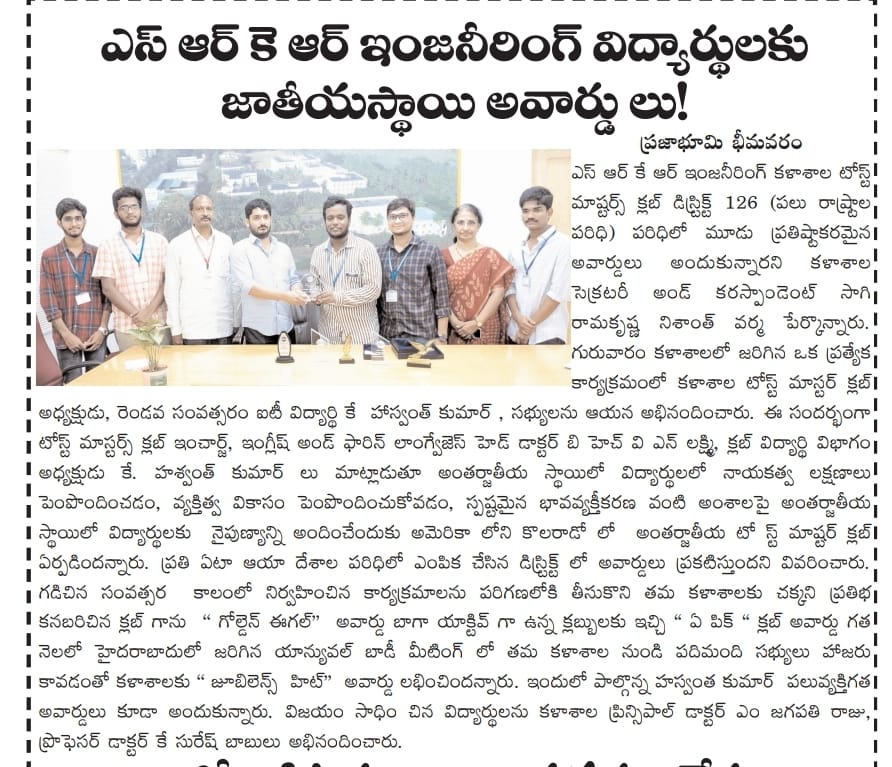 SRKR Toastmasters Club has won 3 prestigious awards at the National Level, Secretary and