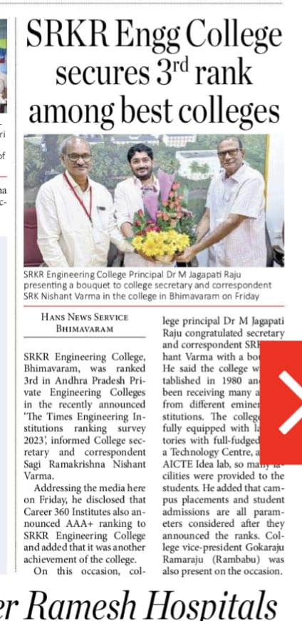 SRKR Engg College stood at 3 rd Rank in Times Rankings and AAA+ in Career 360 rankings, Principal of