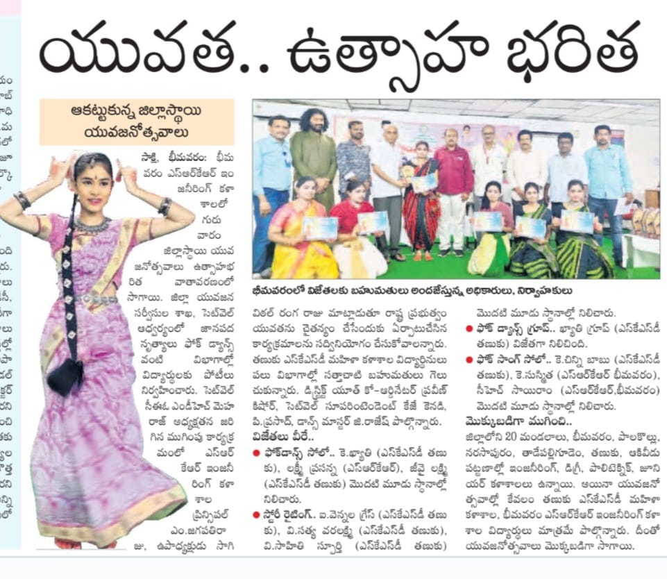 The announcement of the district-level youth festival winners was made by Setwell CEO M.D. Mehraj. The event, held at SRKR Engineering College, Bhimavaram, under the auspices of the District Youth Services Department, Khyati Group from SKAC Women's College, Tanuku, securing the top spot in the Folk Dance (Group) category. In the Folk Song (Solo) category, K. Chinnibabu from Tanuku claimed the first position, with N. Sushmita and CH Sairam from Bhimavaram attaining the second and third positions, respectively.