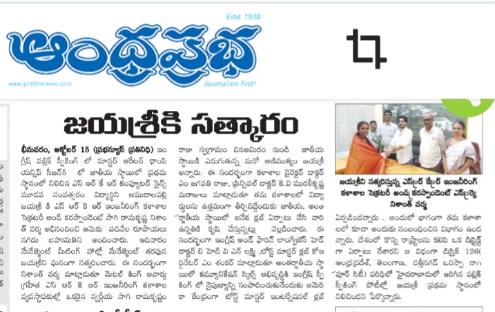 Sagi Ramakrishna Nishanth Varma, Secretary and Correspondent of SRKR, congratulated Amudalapalli Jayashree, a third-year Computer Science student, for her first-place win in the national Master Orator Championship for English Public Speaking. He announced a cash prize of ten thousand rupees. Jayashree was felicitated in the college's management meeting hall with the presence College Director Dr. M Jagapathiraju, and Principal Dr. KV Murali krishnam raju
