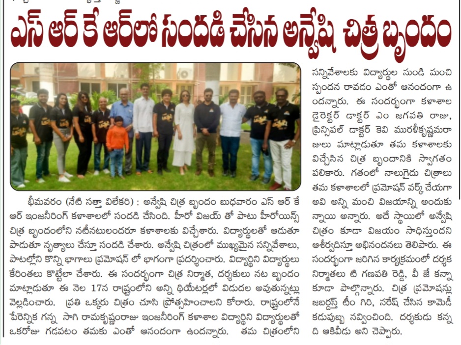 The Anveshi movie team's recently visited SRKR Engineering College for movie promotions. Engaging in interactive sessions and screenings, the team shared invaluable insights into the film industry, fostering a direct link between academia and entertainment.Distinguished guests from Anveshi added value to the event, giving students a firsthand look into the practical aspects of their work in the real world. The event not only showcased active student participation but also opened doors for potential collaborations . The impact of this visit extends beyond the day, empowering students to envision possibilities beyond conventional boundaries. Explore the vibrant snapshots of this memorable day in our photo gallery, encapsulating the spirit of creativity and learning that defines SRKR Engineering College.