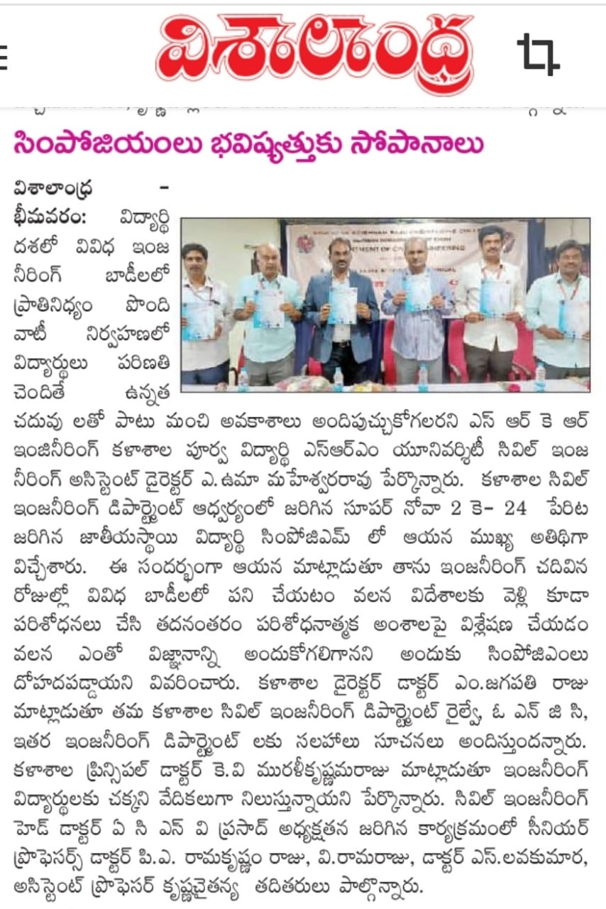 "Former student of SRKR Engineering College, now Assistant Professor of Civil Engineering at AP SRM University, A. Umamaheswararao, addressed students at the SuperNova 2k24 National-Level Symposium, highlighting the significant opportunities available through research and study in various engineering bodies, both domestically and internationally. Reflecting on his own journey from engineering education to overseas exploration and subsequent in-depth research analysis, Umamaheswararao emphasized the immense scientific discoveries that symposiums like SuperNova foster. Director of the college, M. Jagapathiraju, reiterated the importance of such events in nurturing academic growth and fostering innovation within the Civil Engineering Department."
