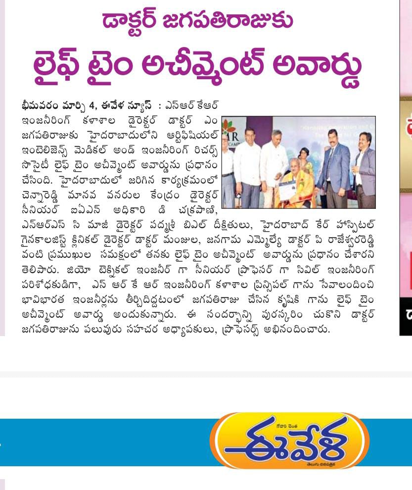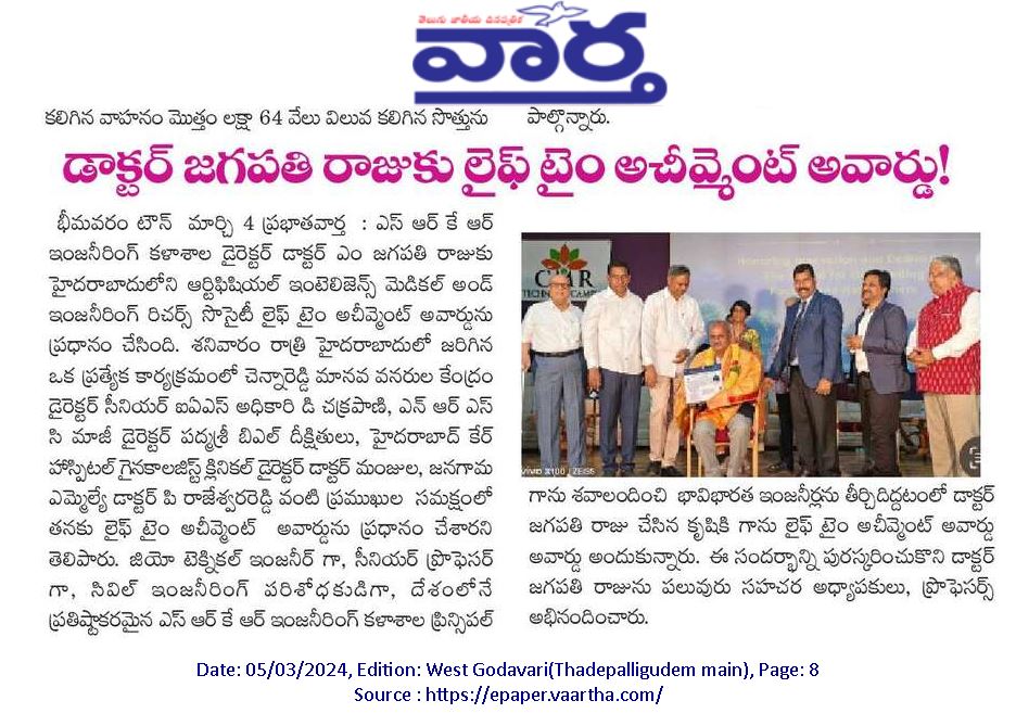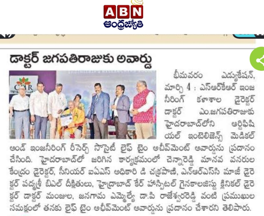 S. R. K. R. Engineering College Director Dr. M. Jagapathi Raju was honored with the Lifetime Achievement Award by the Artificial Intelligence Medical and Engineering Research Society in Hyderabad. The special event, held on Saturday night in Hyderabad, featured former Director of NRSC Padma Sri B L Deekshithulu, Director of Hyderabad Care Hospital gynaecologist Dr.Manjula, and Janagama MLA Dr. P. Rajeshwar Reddy as prominent figures. They highlighted Dr. Jagapathi Raju's significant contributions to the field of civil engineering research, both nationally and internationally, during his tenure as principal at SRKR Engineering College, which has earned widespread acclaim. As a Geo-Technical Engineer, Senior Professor, and Principal of SRKR Engineering College, Dr. Jagapathi Raju's lifetime dedication to serving the engineering fraternity has been duly recognized with this prestigious Lifetime Achievement Award. Esteemed colleagues, professors, and well-wishers extended their heartfelt congratulations to Dr. Jagapathi Raju on this occasion.