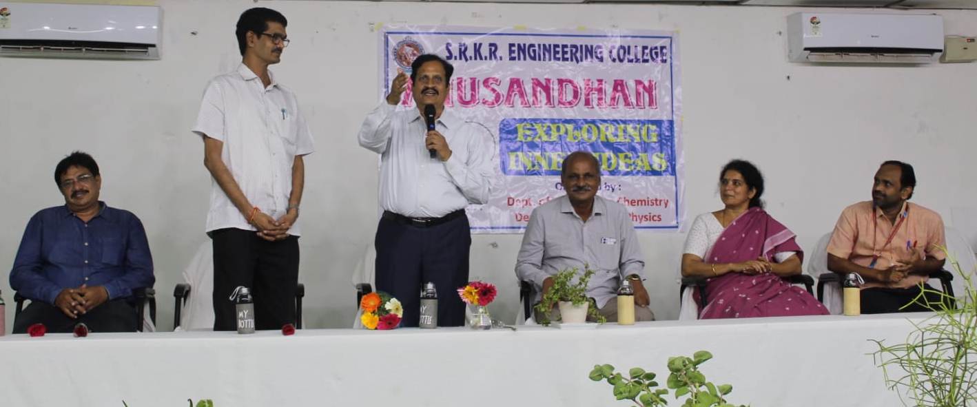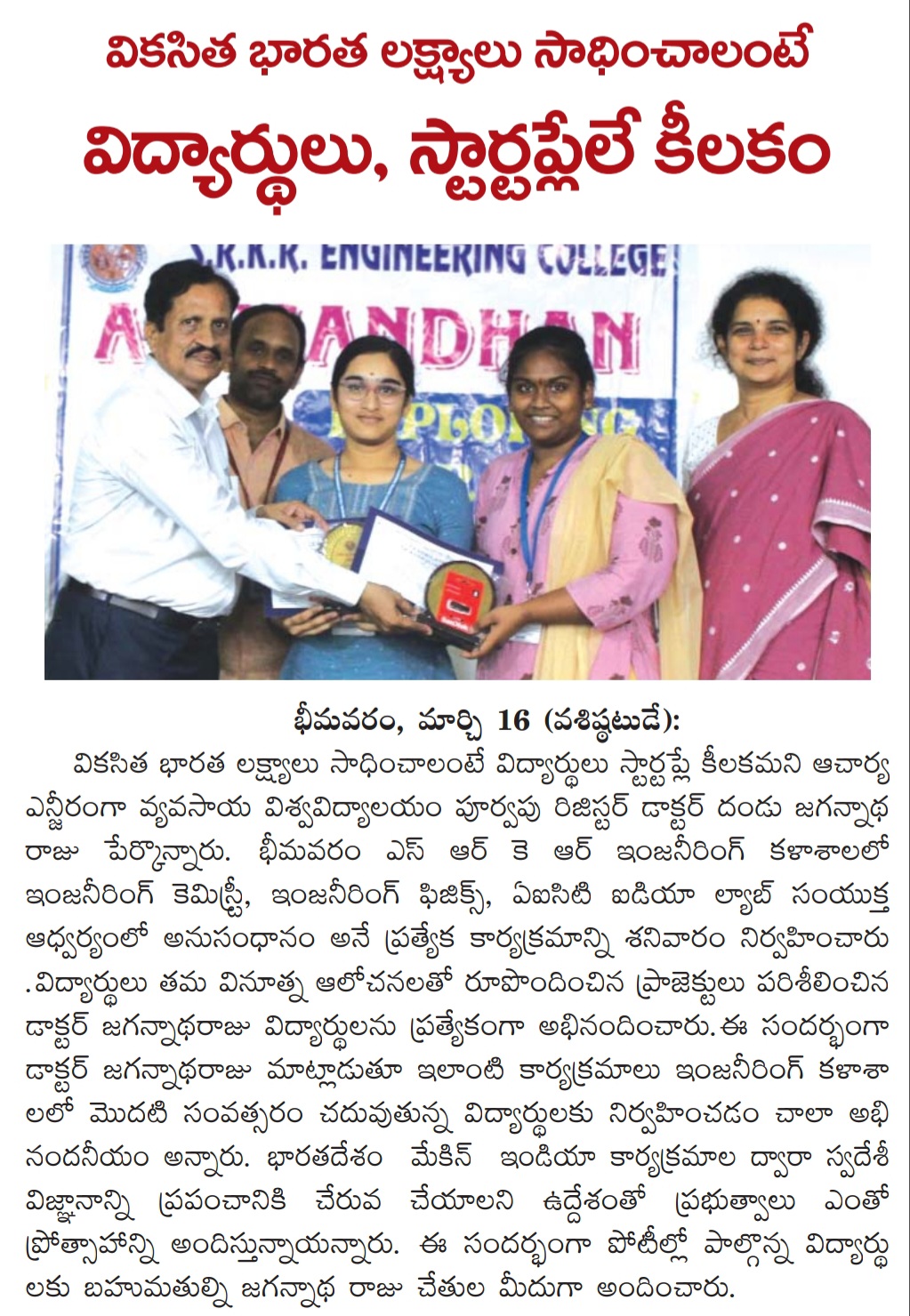 SRKR Engineering College hosted a special program on Saturday, jointly organized by Engineering Chemistry, Engineering Physics, and AICT Idea Lab. Former Registrar of Acharya N.G. Ranga Agricultural University, Dr. Dandu Jagannatharaju garu, emphasized the significance of startups in students' journey towards realizing the vision of a developed India. Dr. Jagannatharaju garu reviewed students' projects, lauding their innovative ideas, and commended the college for fostering such initiatives among first-year engineering students.