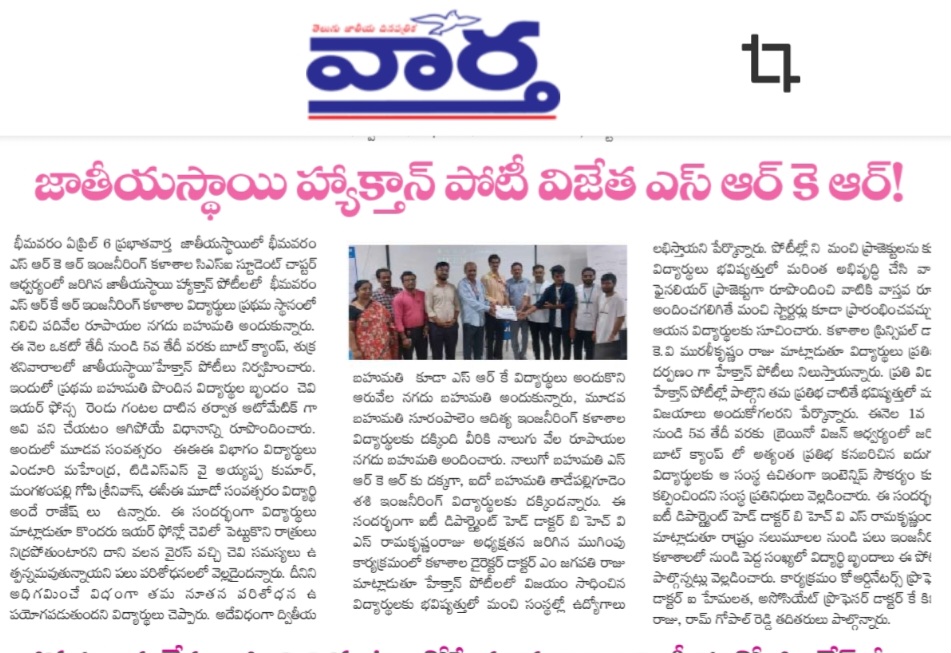 Students from SRKR Engineering College in Bhimavaram achieved a remarkable feat by securing the first place and a cash prize of ten thousand rupees in a national-level hackathon competition organized by the CSI Student Chapter. The competition, dubbed 'Hecton', spanned from the 1st to the 5th of this month, featuring boot camps and rigorous competitions held on Fridays and Saturdays.