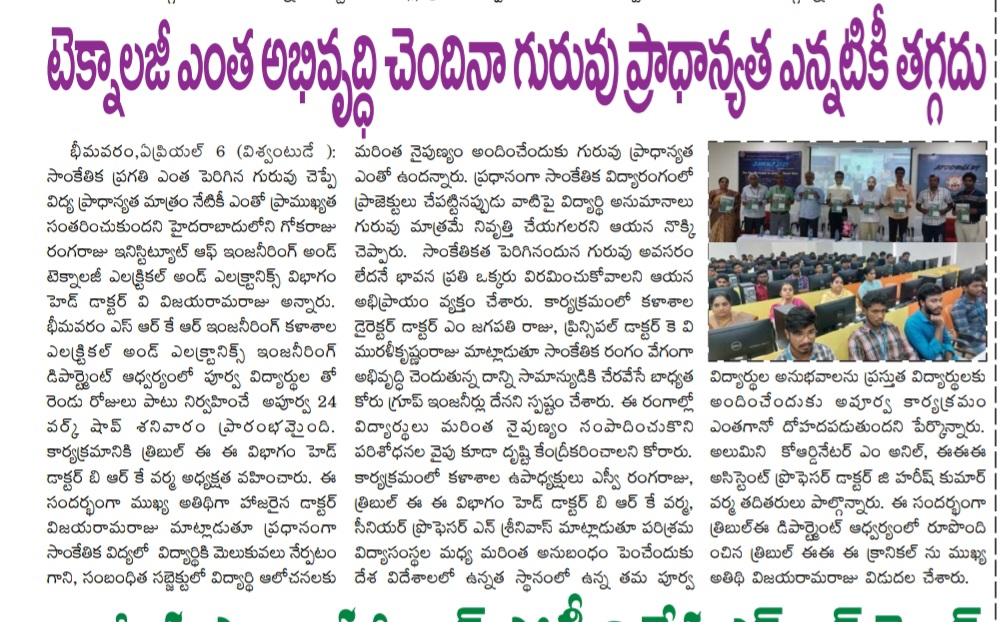 College Director M Jagapathiraju garu and Principal KV Murali Krishnamraju garu echoed Vijayaramaraju's sentiments, noting the rapid development of the technology sector and the increasing demand for skilled engineering professionals. Vijayaramaraju garu urged students to focus on research to stay abreast of these advancements. Following his address, Vijayaramaraju garu unveiled the Triple EE Chronicle, a publication crafted by the students. The event was attended by College Vice President Sagi Withalangaraju garu, EEE Department Head BRK Verma garu, N Srinivas garu, Alumni Coordinator M Anil garu, G Harish Kumar Verma garu, and other dignitaries.