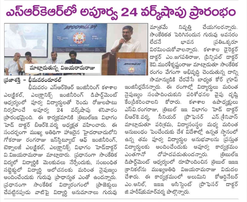 Bhimavaram: V Vijayaramaraju garu, Head of the Department of Electrical and Electronics at Gokaraju Rangaraju Institute of Engineering and Technology, Hyderabad, emphasized the importance of research for all students. Speaking at the inauguration of the two-day Apoorva 24 workshop with alumni at Bhimavaram's SRKR Engineering College, Vijayaramaraju garu stressed that teachers should prioritize equipping students with technical skills and nurturing their critical thinking abilities in relevant subjects. He highlighted the pivotal role of teachers in clarifying students' doubts, particularly during project undertakings.