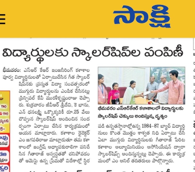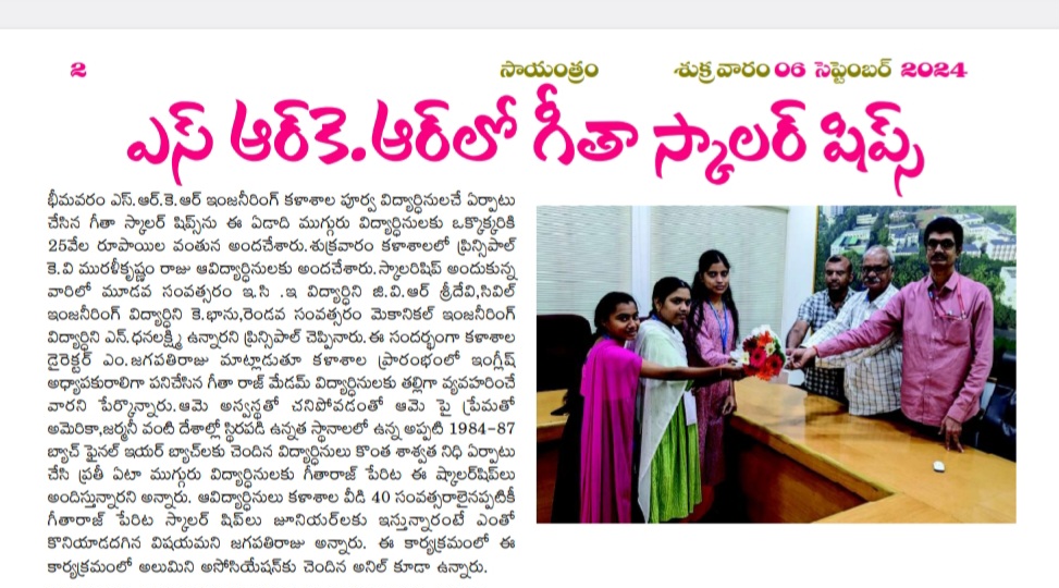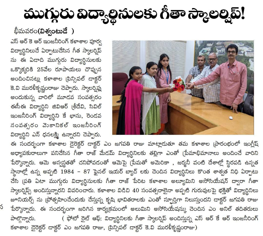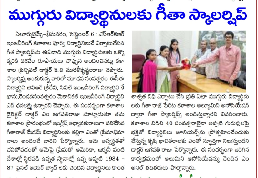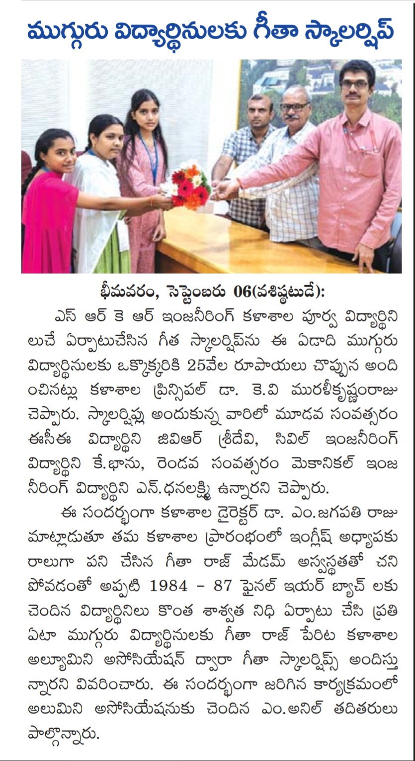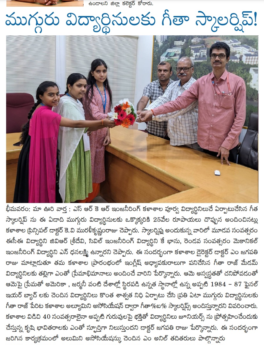 Bhimavaram: On Friday, SRKR Engineering College proudly announced the recipients of the prestigious Geetha Scholarship, awarded by the college's alumni to honor the legacy of Geeta Raj, a beloved former English teacher. This year, three outstanding female students were awarded scholarships of ₹25,000 each.