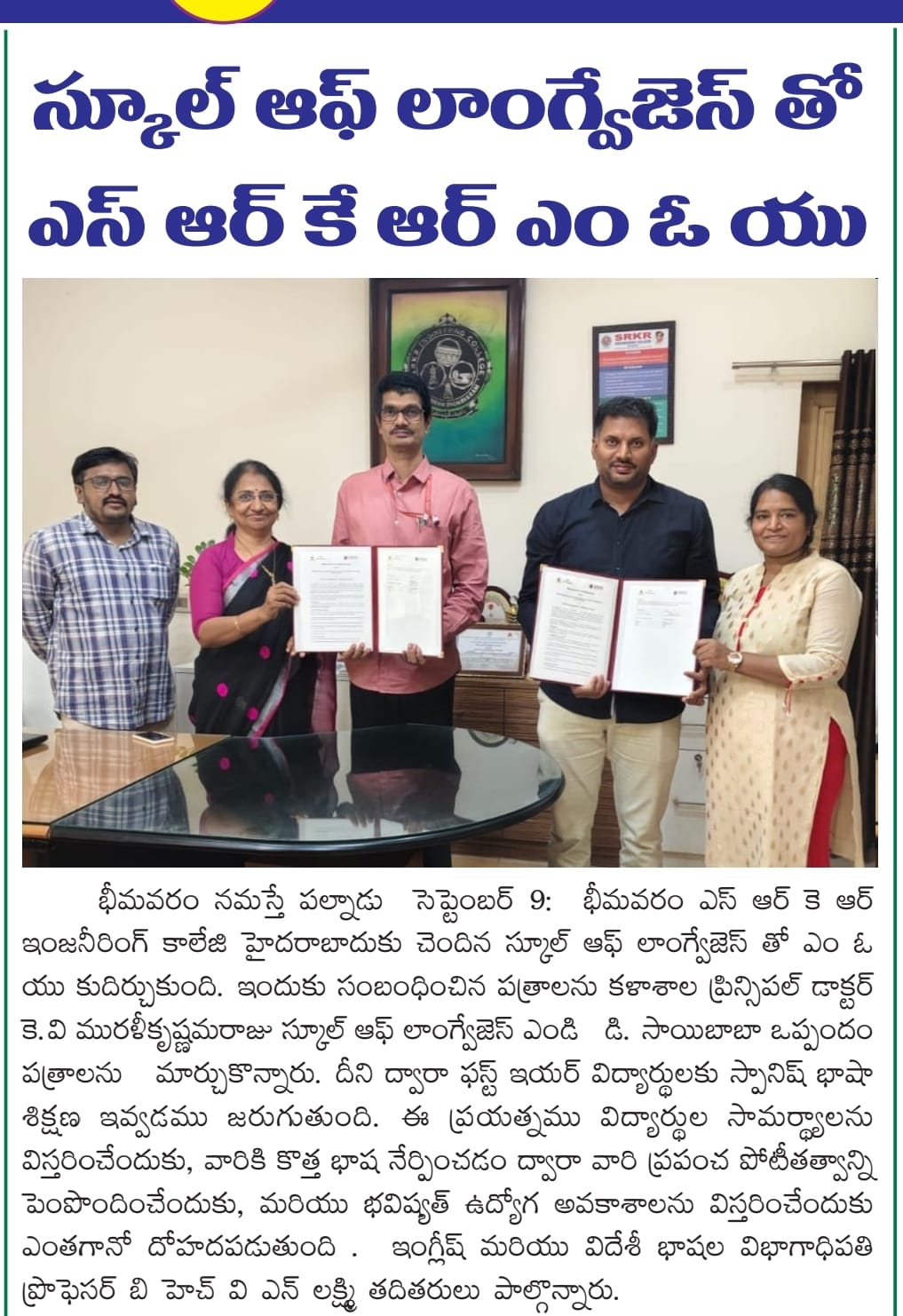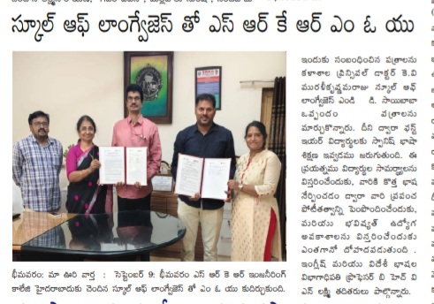 Bhimavaram: Ma Uri Vartha September 9 Bhimavaram SRK Engineering College has entered into an MoU with the School of Languages of Hyderabad.