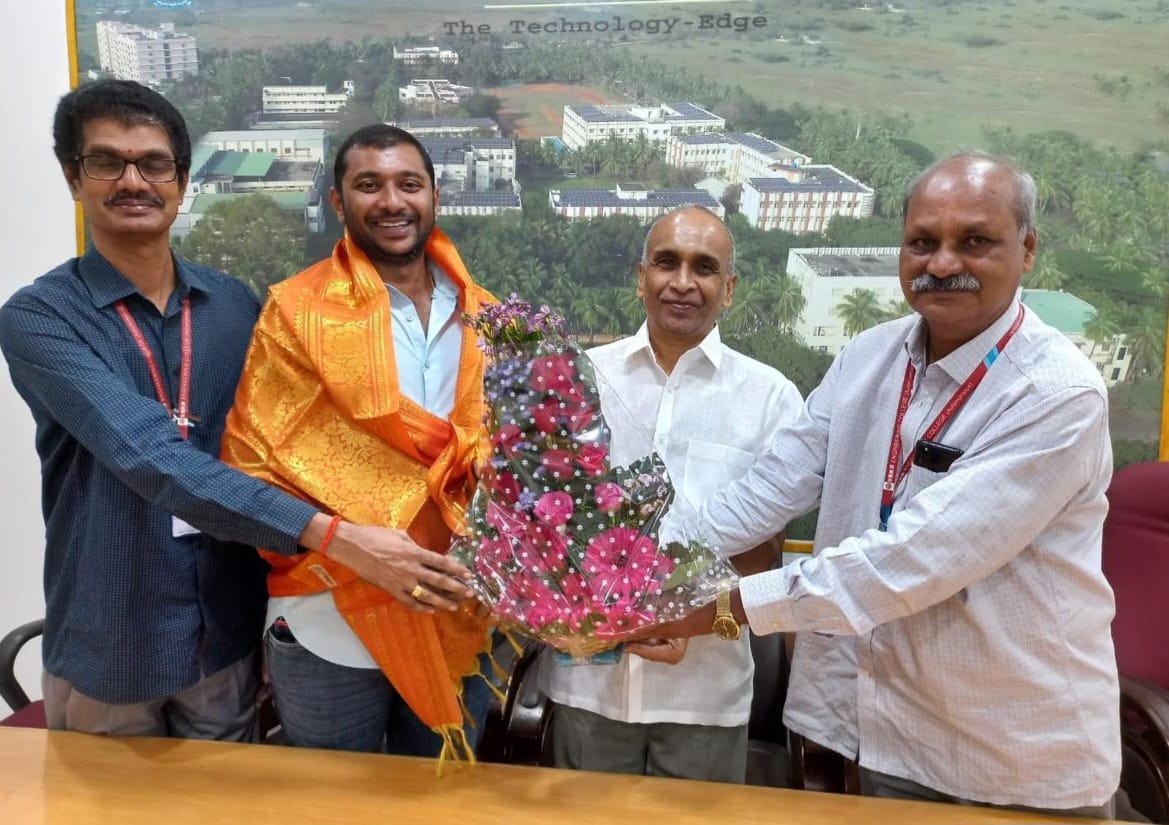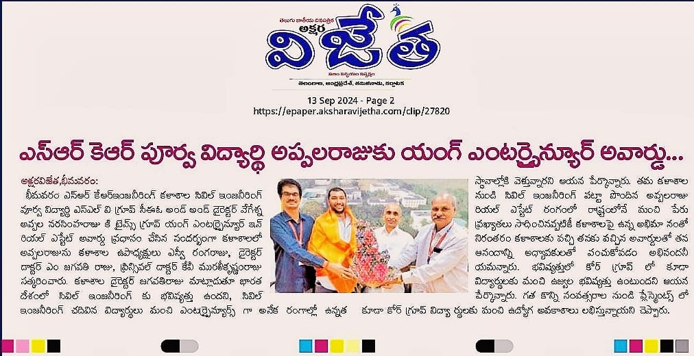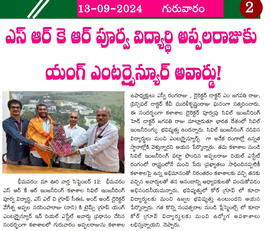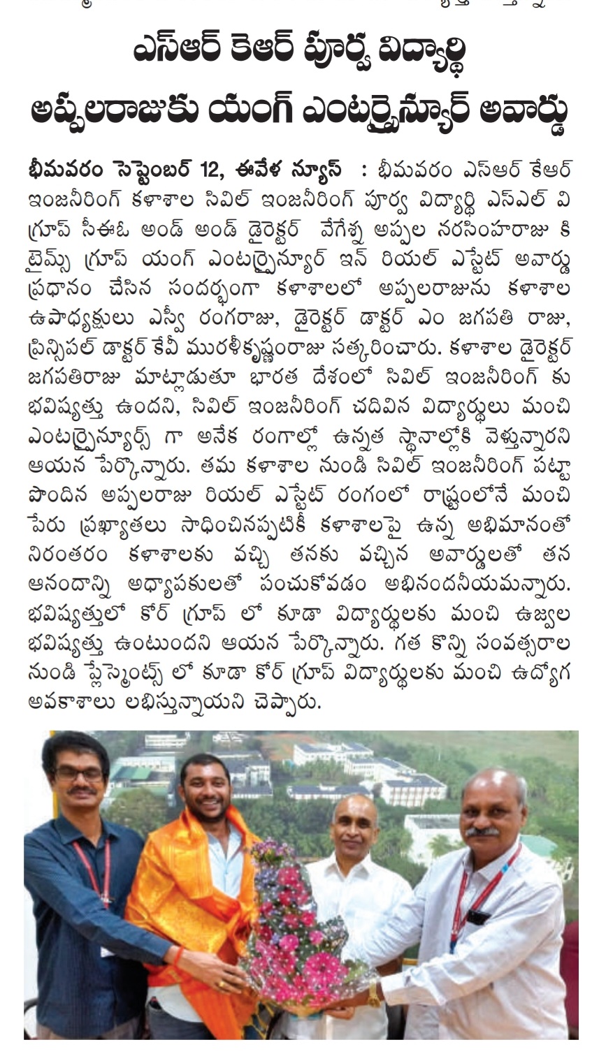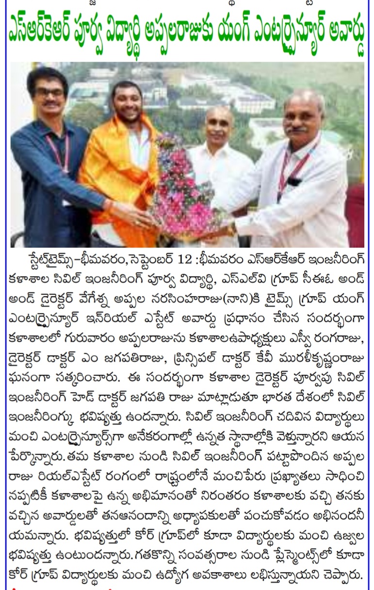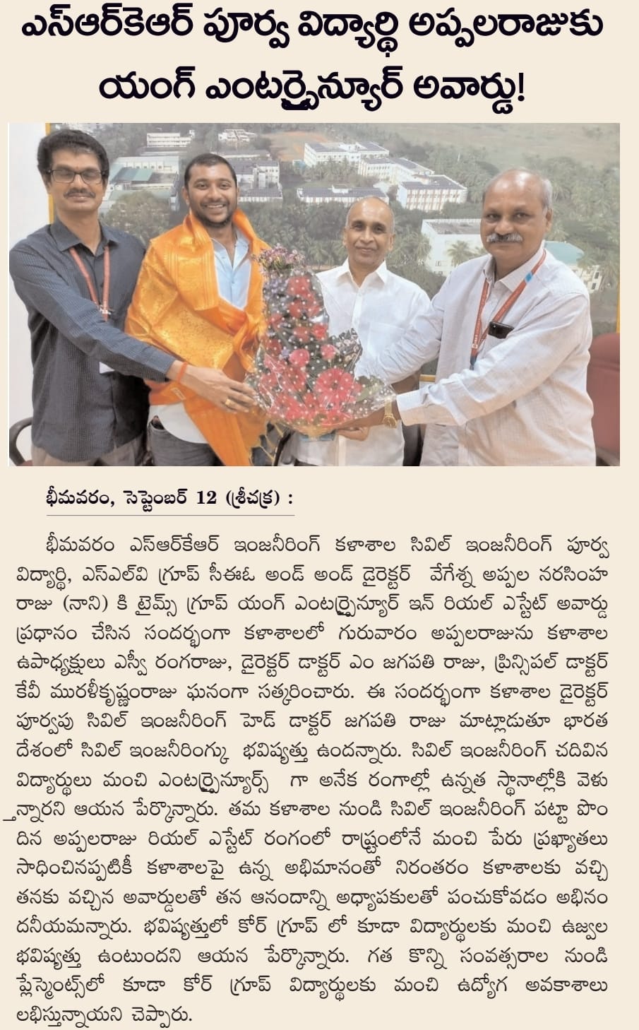 Bhimavaram, September 12: SRKR Engineering College proudly congratulates civil engineering alumnus Vegesna Appala Narasimharaju (Nani), who was awarded the Times Group Young Entrepreneur Real Estate Award. The award ceremony took place on Thursday, where Appala Narasimharaju was honored by College Vice President S.V. Rangaraju, Director Dr. M. Jagapathi Raju, and Principal Dr. K.V. Muralikrishnam Raju.