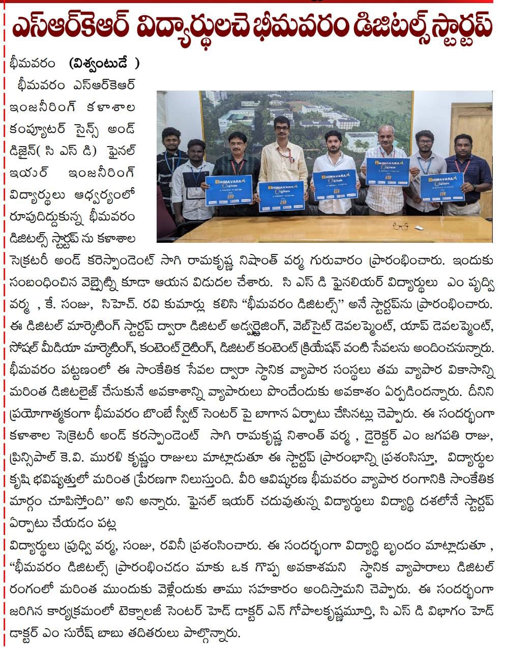 SRK Engineering College students have launched a new startup called Bhimavaram Digitals. This initiative, led by final-year students from the Computer Science and Design (CSD) Department, focuses on digital marketing, advertising, website development, and app engineering. Under the supervision of college faculty, the startup will also offer services in social media marketing and content creation.
