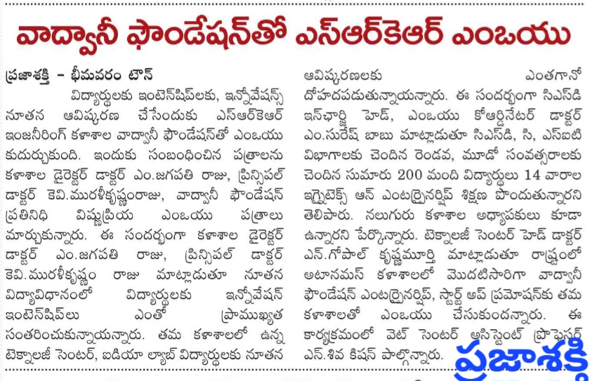 Bhimavaram: In a significant step towards enhancing educational outcomes, SRKR Engineering College has emphasized the importance of innovations and internships for students. During a recent event, College Director M. Jagapathi Raju and Principal Dr. KV Muralikrishnam Raju spoke about the crucial role these elements play in modern education.