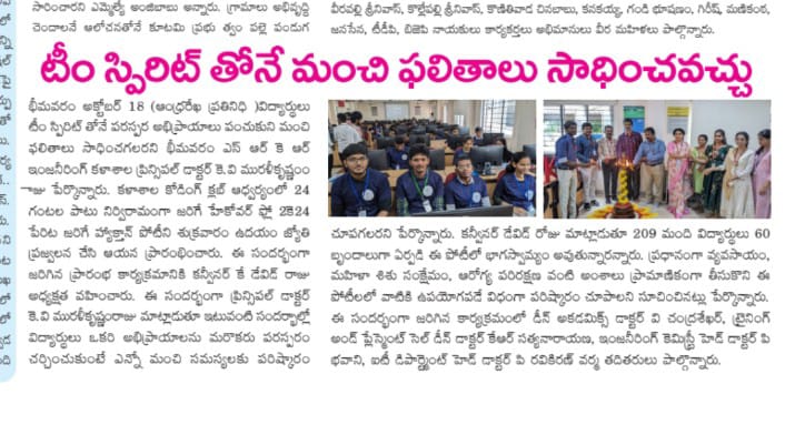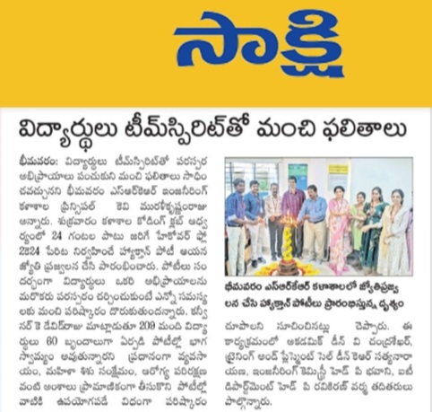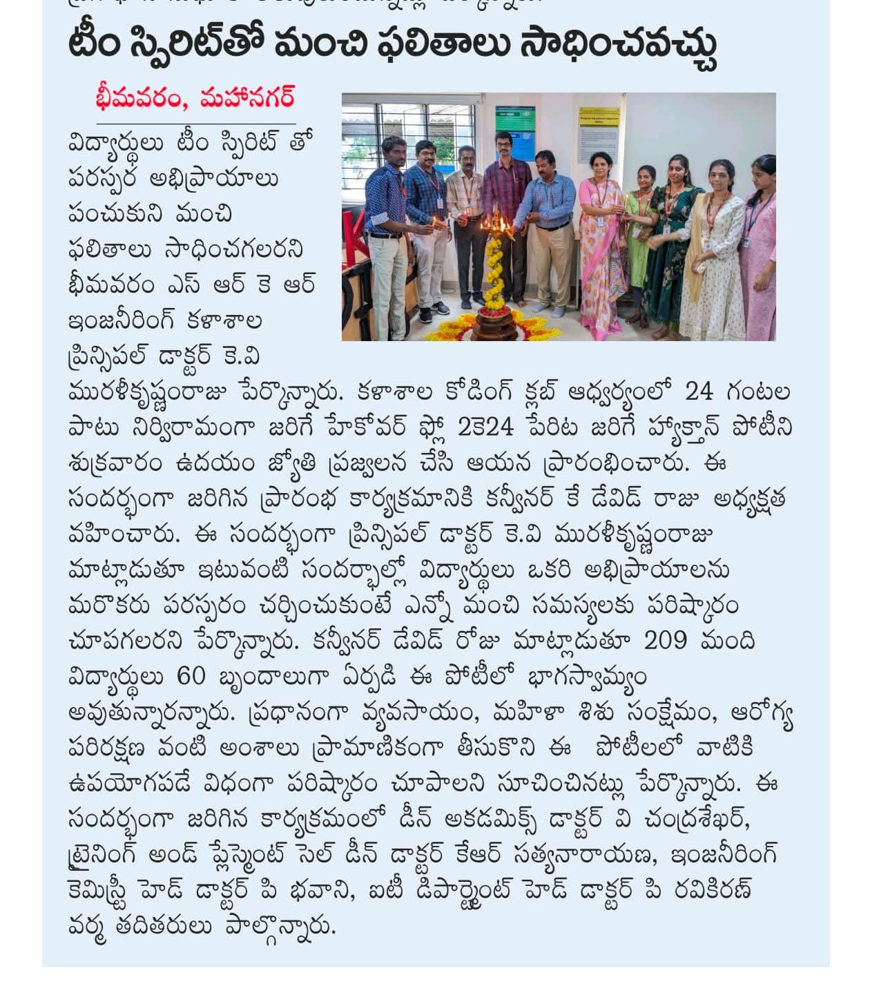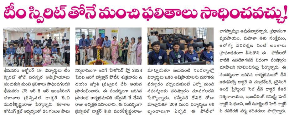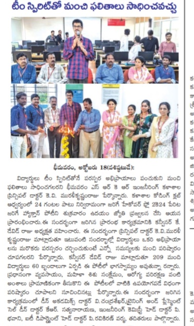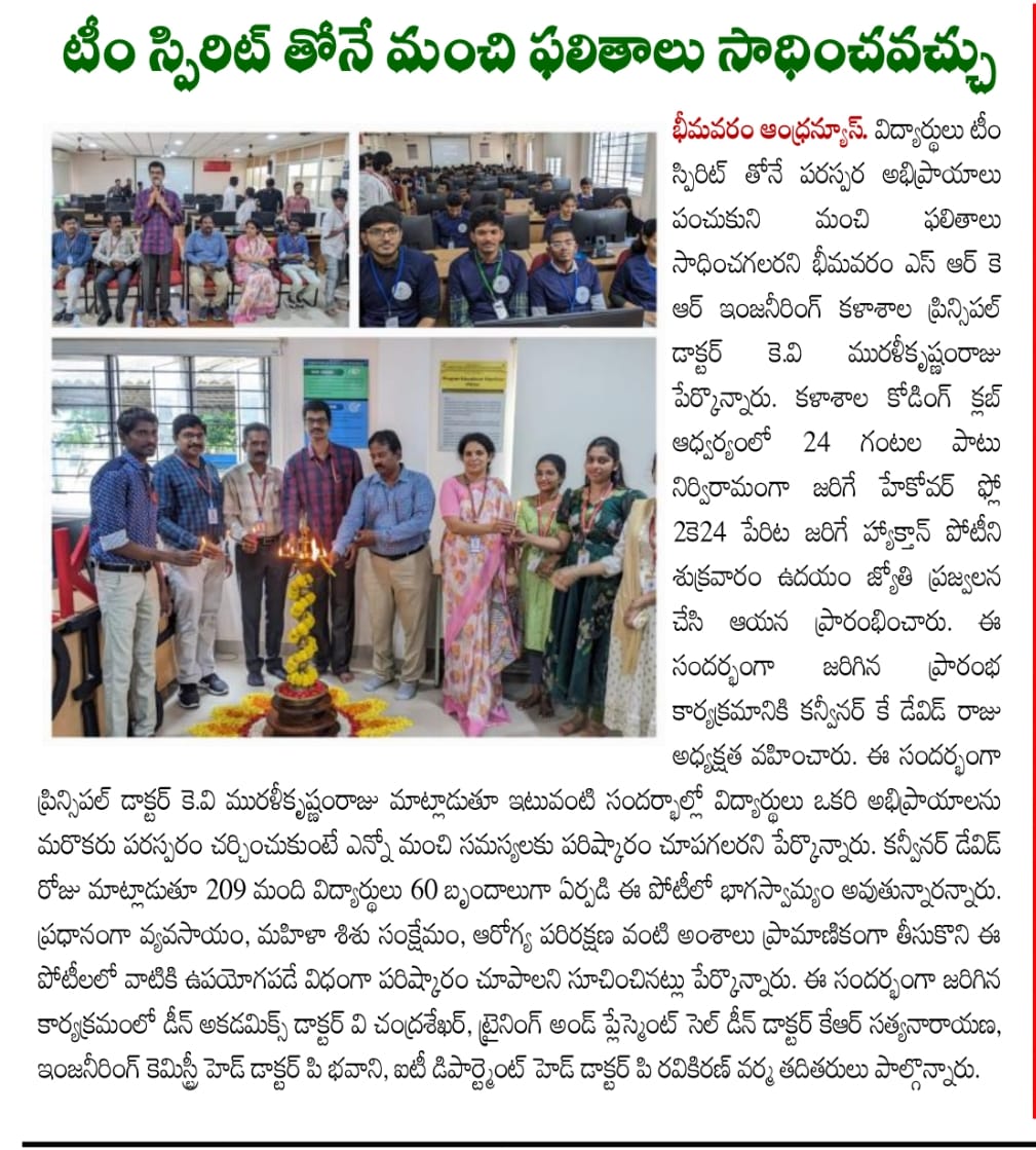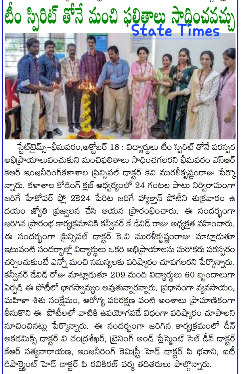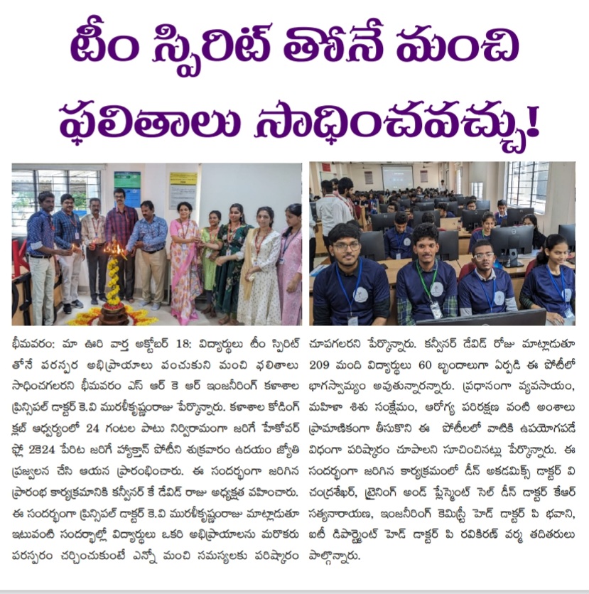 Bhimavaram, October 18: Dr. KV Muralikrishnamraju, Principal of Bhimavaram SRK Engineering College, highlighted the importance of team spirit in achieving excellent results during the inauguration of the hackathon competition, "Hackover Flow 2K24." The event commenced on Friday morning with the ceremonial lighting of the torch.