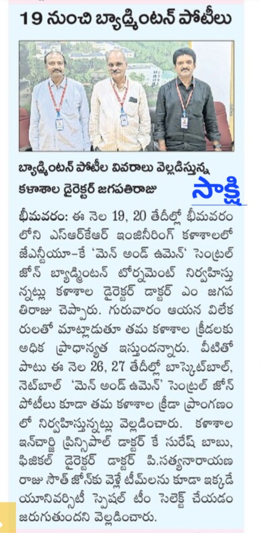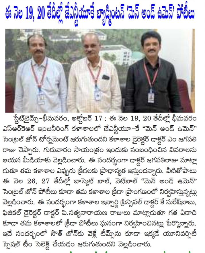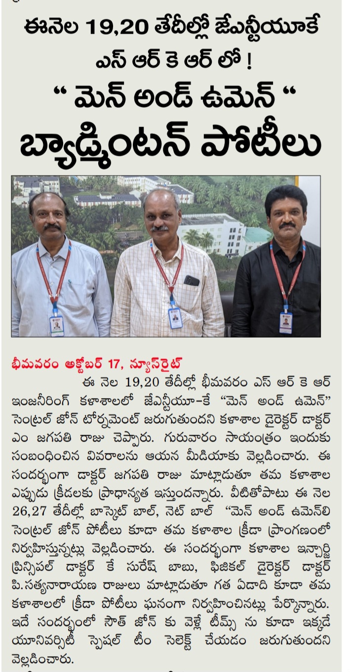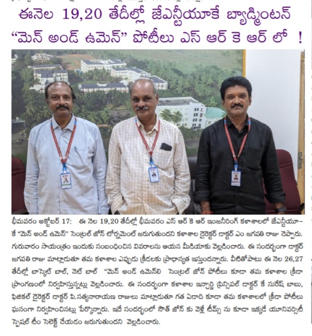 Bhimavaram, October 17: The JNTUK Central Zone "Men and Women" Badminton Tournament is set to take place on October 19th and 20th at Bhimavaram SRK Engineering College. This announcement was made by Dr. M. Jagapathi Raju, Director of the college, during a press briefing on Thursday evening.