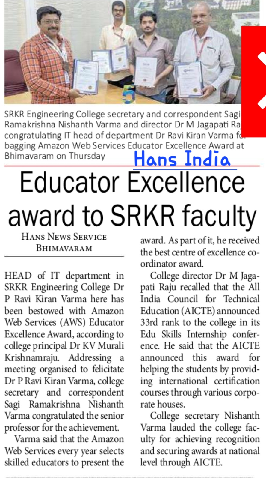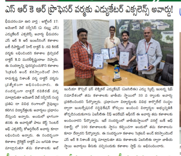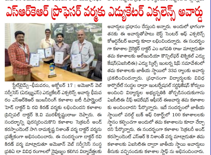 Bhimavaram, October 17: We are proud to announce that Dr. P. Ravi Kiran Verma, Head of the IT Department at SRR Engineering College, has been honored with the Amazon Web Services (AWS) Educator Excellence Award. This recognition highlights Dr. Verma's contributions to education and innovation in technology. The announcement was made by College Principal Dr. KV Muralikrishnamraju.