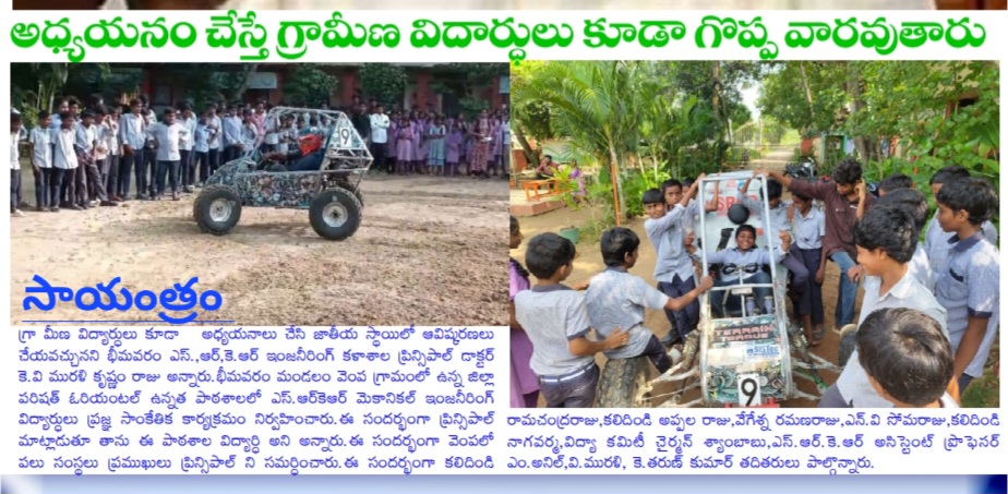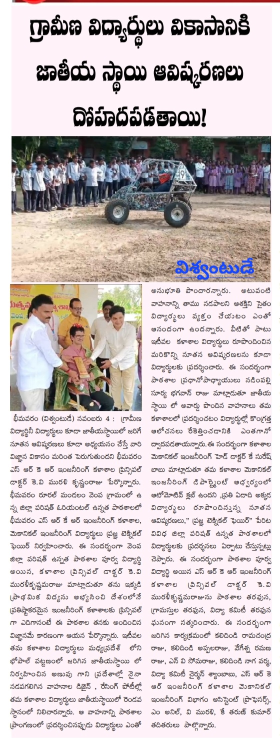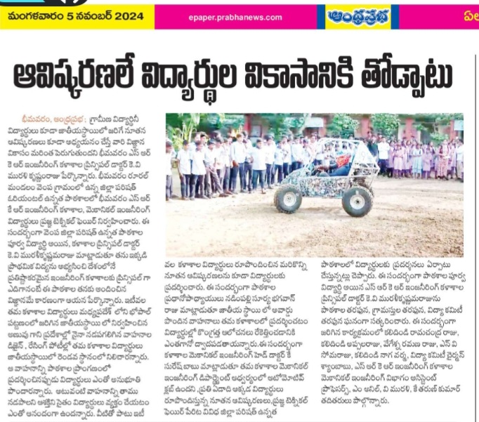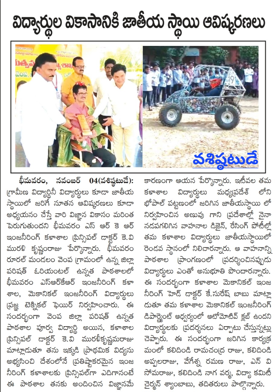 Dr. K. Suresh Babu, Head of Mechanical Engineering, explained that the Automotive Club UKV, under the Mechanical Engineering Department of SRKR Engineering College, organizes the Pragya Technical Fair every year, showcasing new inventions by students and providing exposure to the rural students in various Zilla Parishad High Schools.
