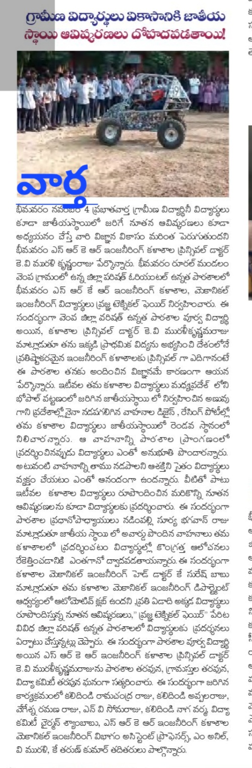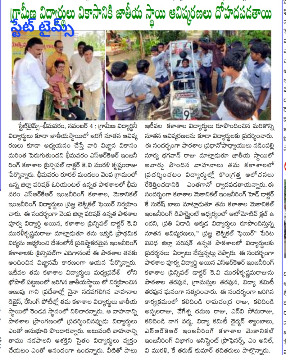 Bhimavaram, November 4: Dr. KV Muralikrishnam Raju, Principal of SRKR Engineering College, emphasized the importance of rural students gaining exposure to national-level innovations to foster their scientific development. His remarks came during the Pragya Technical Fair, organized by the Mechanical Engineering students of SRKR Engineering College at Zilla Parishad Oriental High School, Vempa Village, Bhimavaram Rural Mandal.