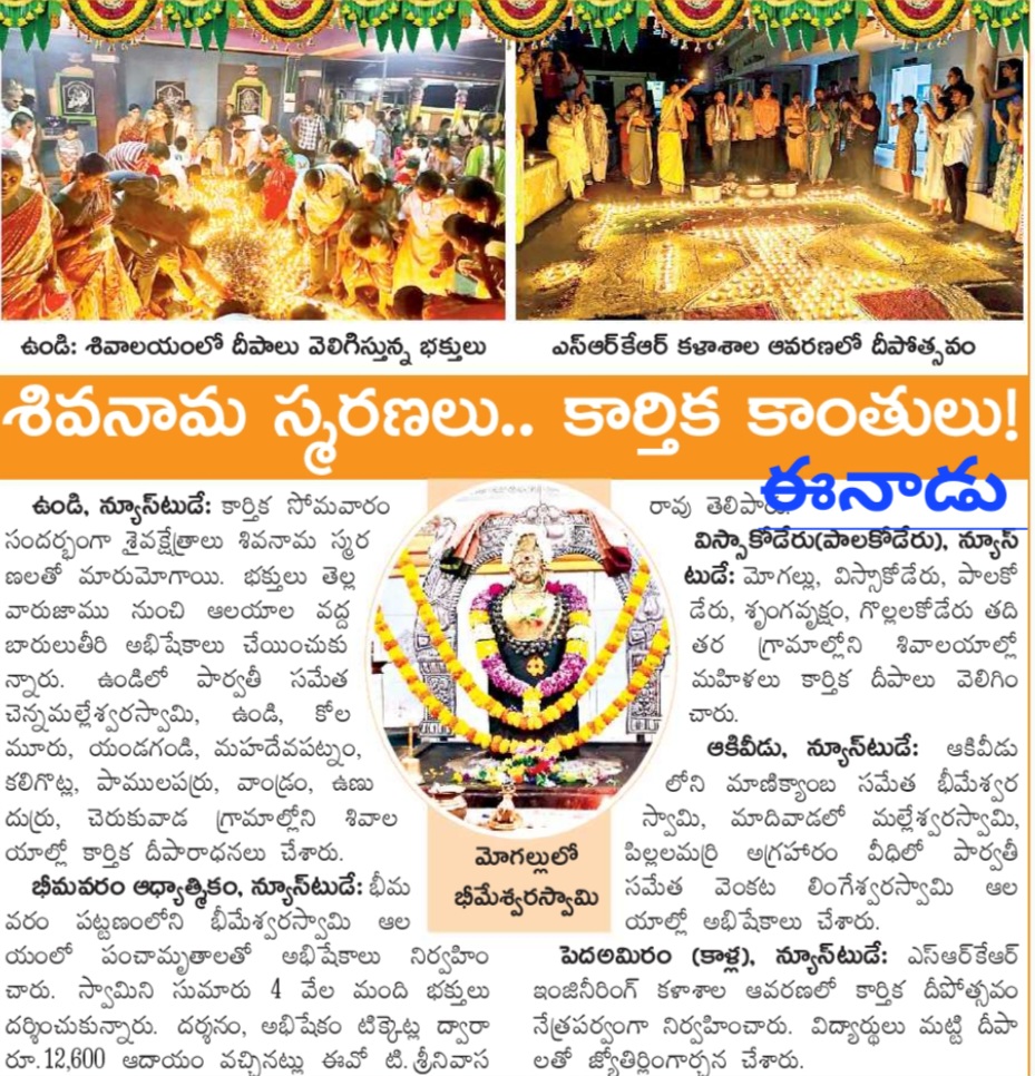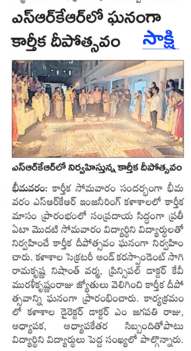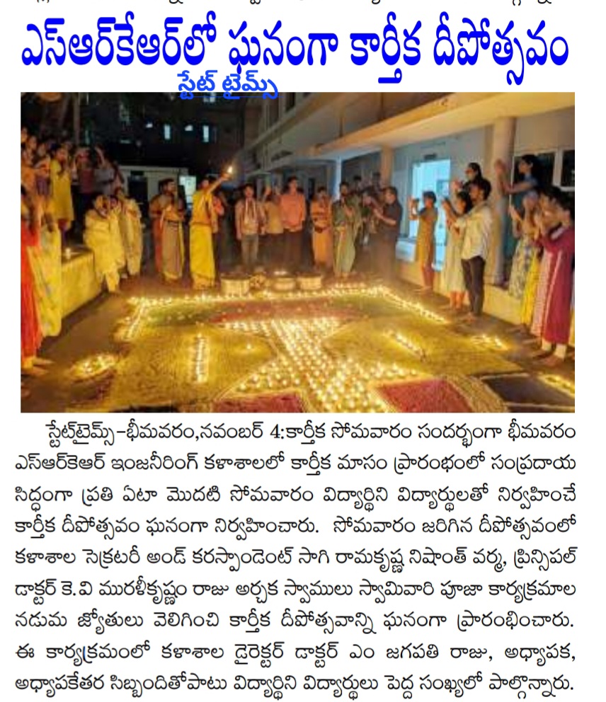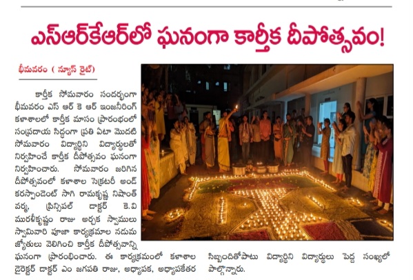 Bhimavaram (November 4): SRKR Engineering College celebrated the auspicious occasion of Kartika Monday with a grand Kartika Deepotsavam organized by the students. This annual event takes place on the first Monday of the Kartika month, marking a significant cultural celebration at the college.