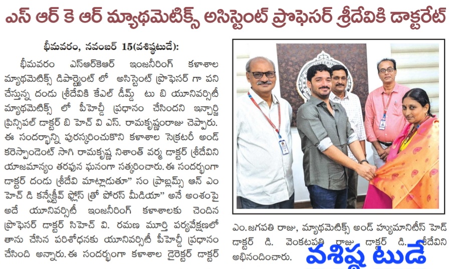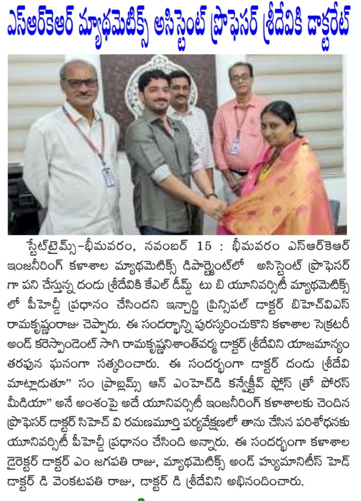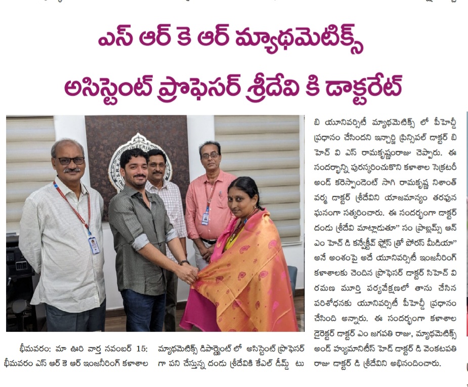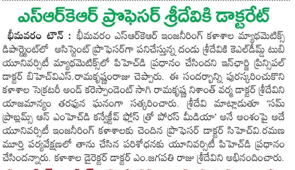 SRKR Engineering College is proud to announce that Dr. D. Sridevi, Assistant Professor in the Department of Mathematics, has successfully earned her Doctorate in Mathematics. The Ph.D. was awarded by B University, with a major focus on Mathematics. Her research, titled "Some Problems on MHD Convective Flows Through Porous Media," was conducted under the supervision of Prof. Dr. CHV Ramana Murthy of the College of Engineering at B University.