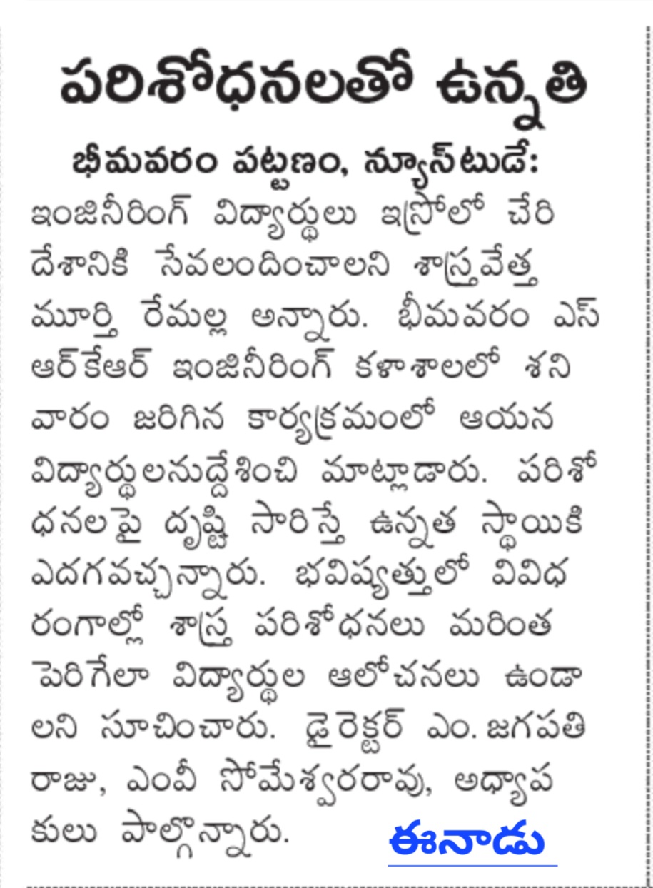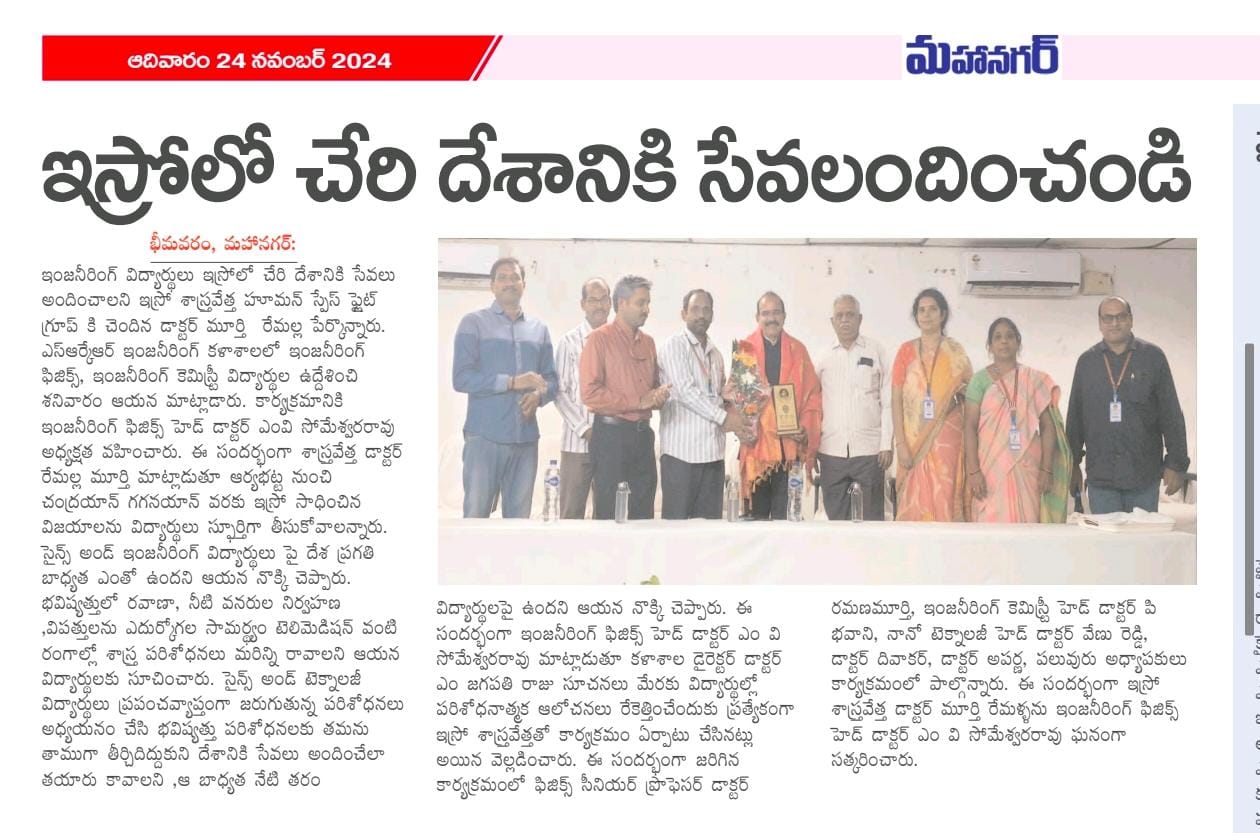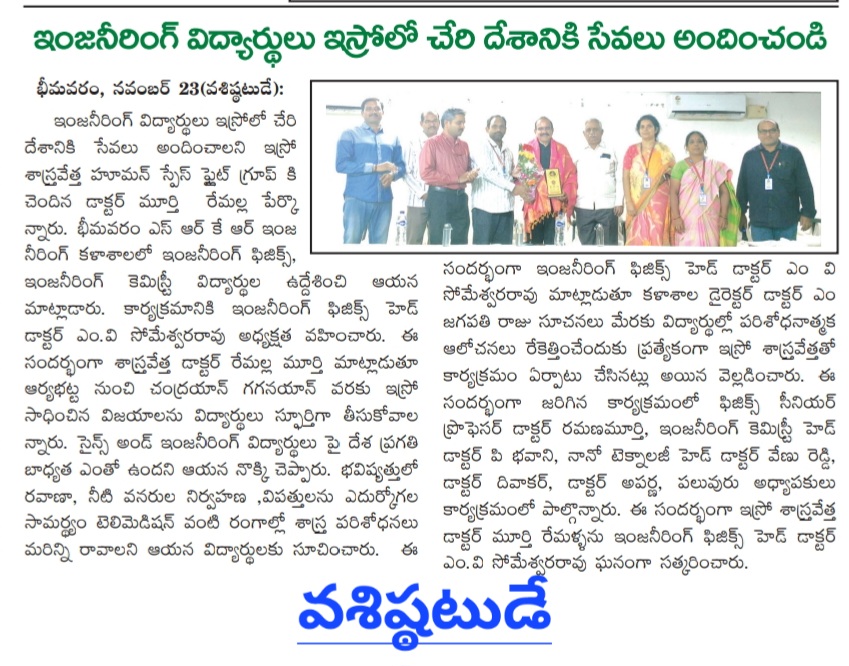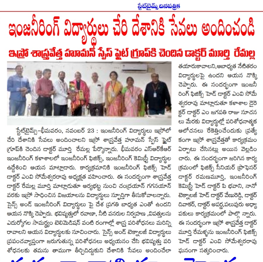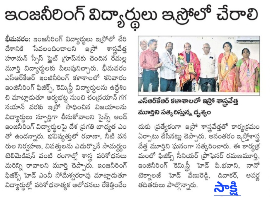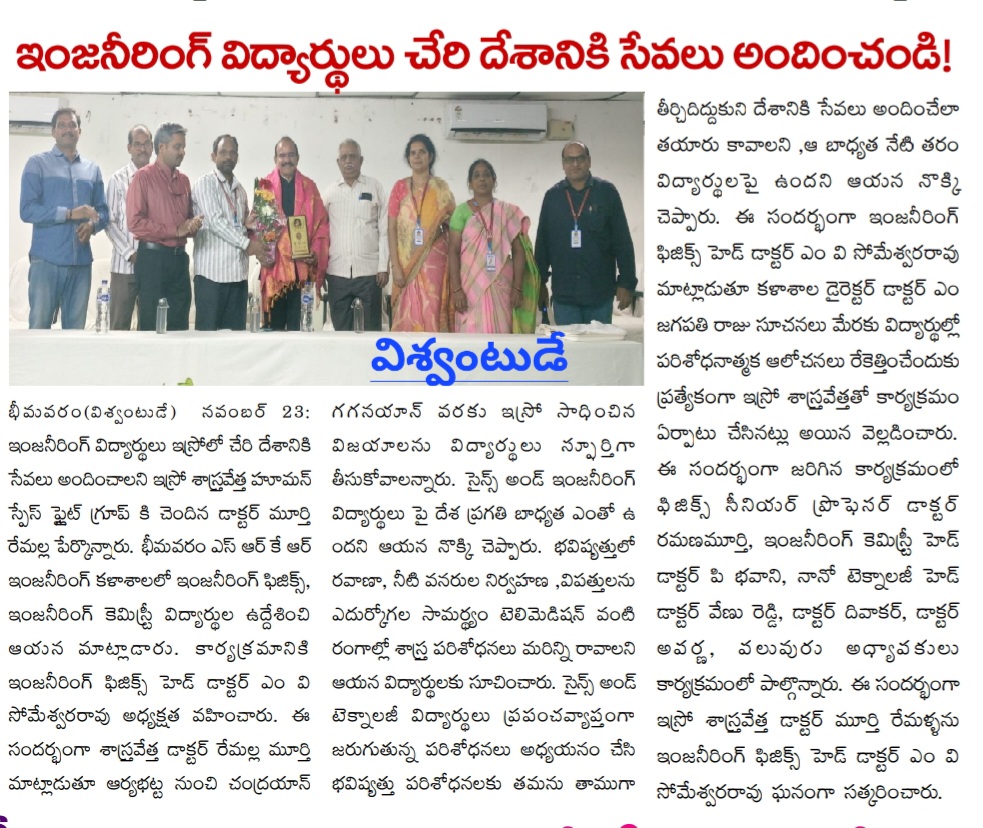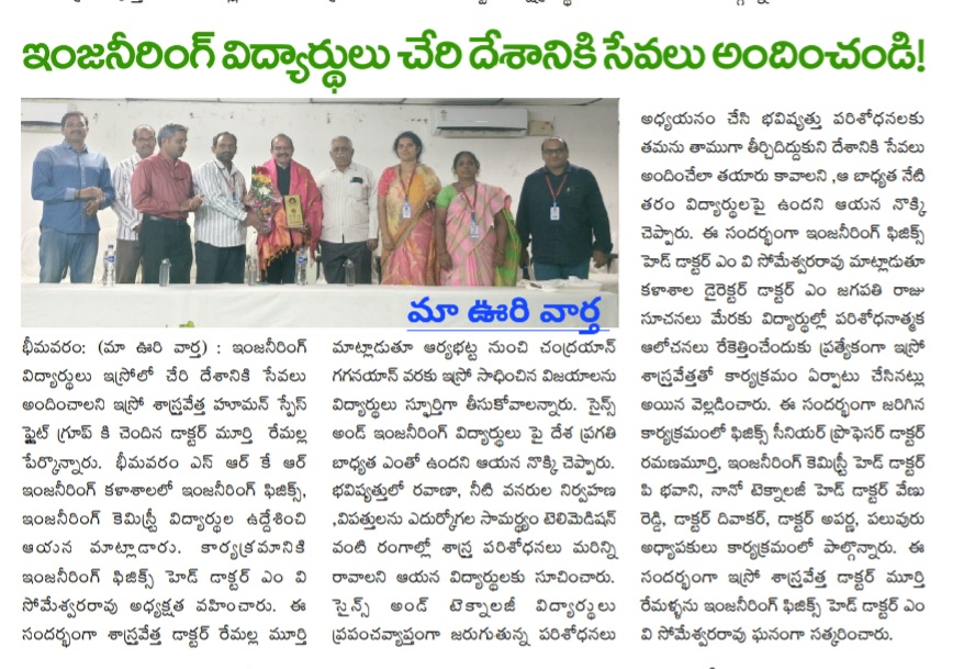 In an inspiring session at SRKR Engineering College, ISRO Scientist Remalla Murthy, from the Human Space Flight Group, encouraged engineering students to pursue careers in space research and contribute to the nation's progress. Speaking to the students of Engineering Physics and Chemistry on Saturday, Murthy emphasized that the future of the country lies in the hands of science and engineering students. He urged them to draw inspiration from the achievements of ISRO, from the launch of Aryabhata to the success of the Chandrayaan and Gaganyaan missions.