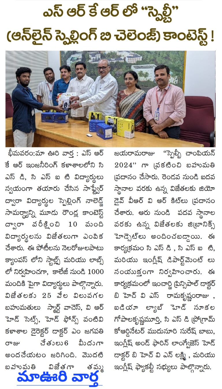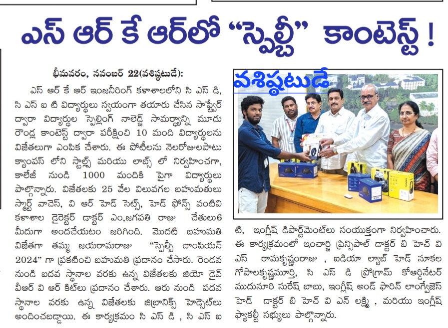 The winners were awarded prizes worth ₹25,000, including smartwatches, VR headsets, and headphones. The awards were presented by the college director, Dr. M. Jagapathi Raju. Tamma Jayaramaraju, who announced the first prize winner, also crowned the "Spellbee Champion 2024."