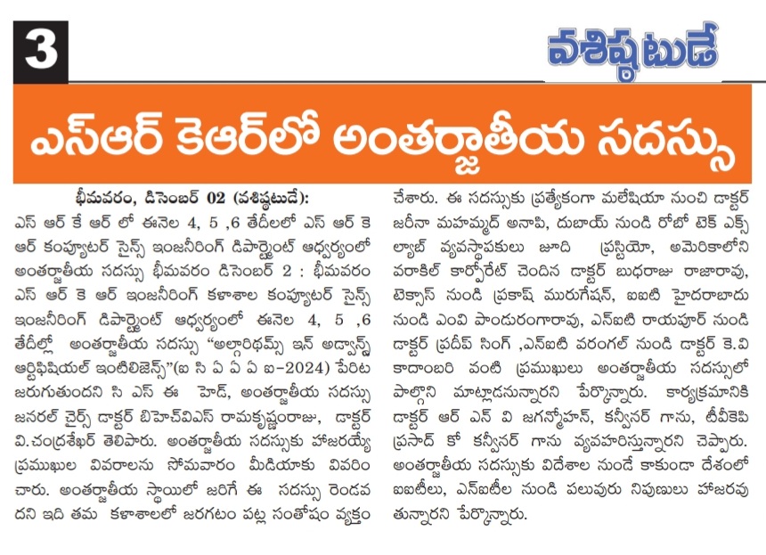 Bhimavaram, December 2: SRKR Engineering College is hosting an International Conference on "Algorithms in Advanced Artificial Intelligence" (ICAA-2024) on the 4th, 5th, and 6th of December. The conference is organized under the auspices of the Computer Science and Engineering Department and is being held at the college for the second time at an international level.