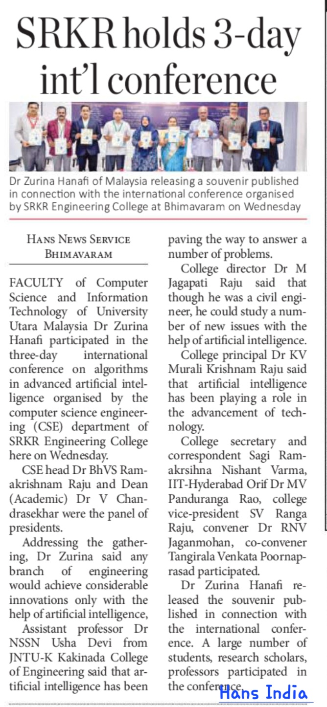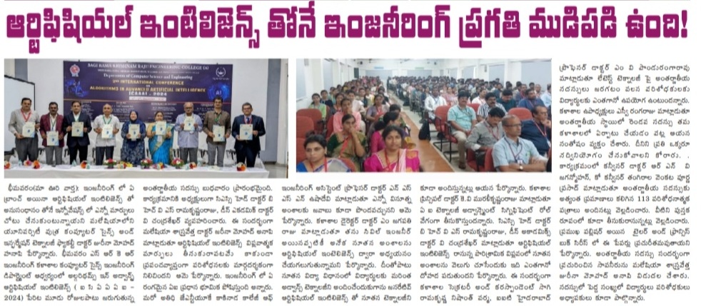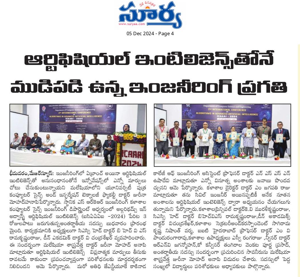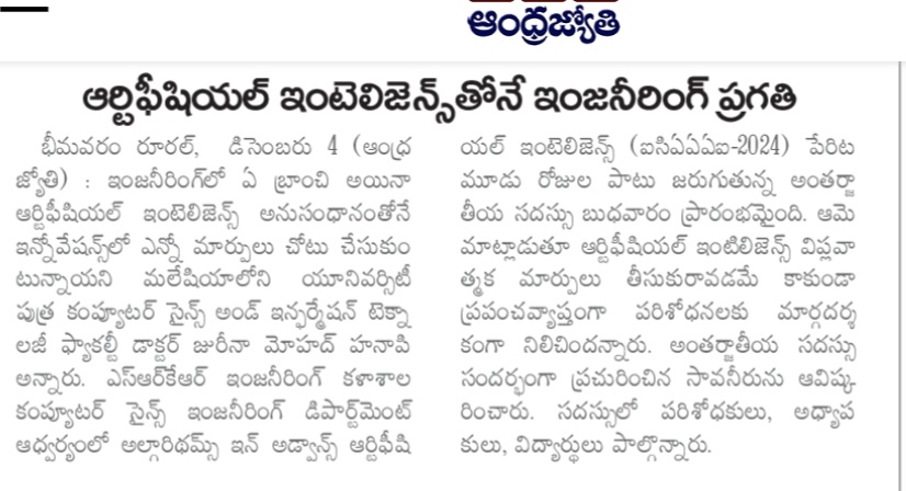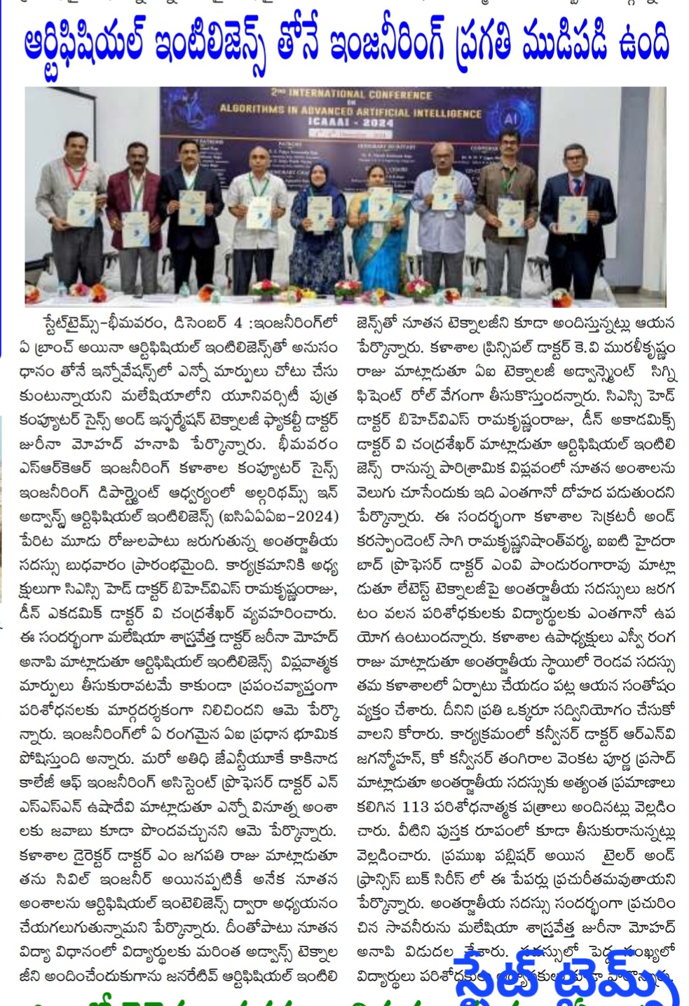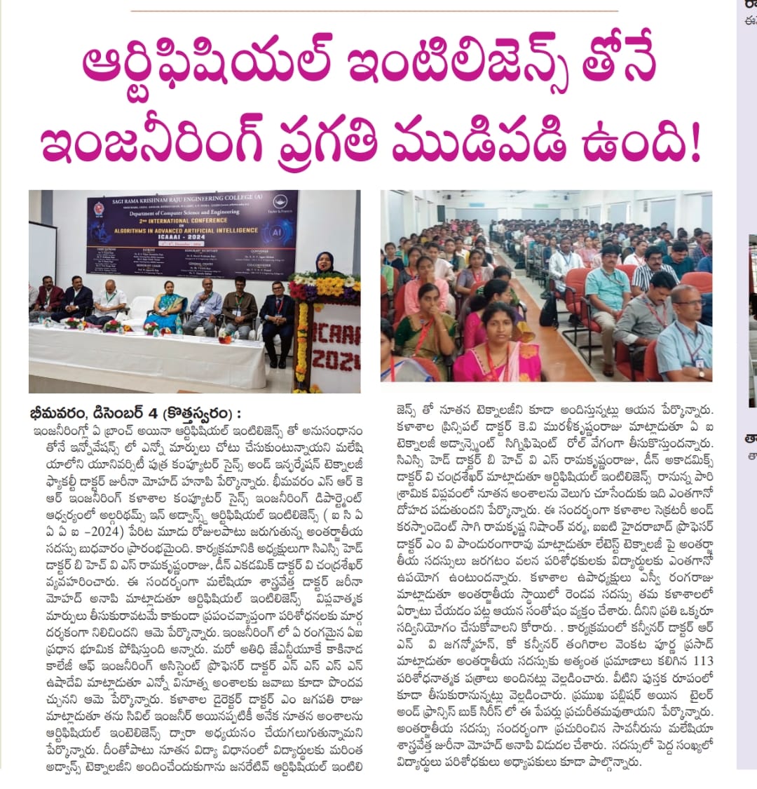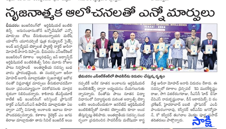 Bhimavaram, December: Experts at the three-day International Conference on Algorithms in Advanced Artificial Intelligence (ICAAI-2024) emphasized the transformative role of Artificial Intelligence (AI) in driving societal progress across various sectors. The conference, organized by the Computer Science and Engineering Department of SRKR Engineering College, concluded on Friday evening, with the participation of distinguished experts and researchers from around the world.
