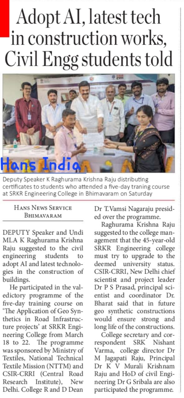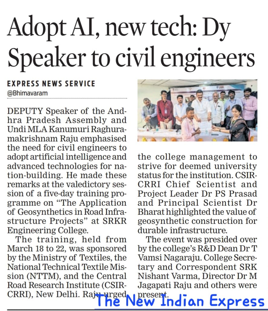 The Deputy Speaker of the Andhra Pradesh Assembly and Undi MLA Kanumuri Raghuramakrishnam Raju, emphasized the need for civil engineers to adopt artificial intelligence and advanced technologies for nation-building during a five-day training program on "The Application of Geosynthetics in Road Infrastructure Projects" held at SRKR Engineering College. The training, sponsored by the Ministry of Textiles, the National Technical Textile Mission (NTTM), and the Central Road Research Institute (CSIR-CRRI), New Delhi, was attended by various dignitaries, including CSIR-CRRI Chief Scientist and Project Leader Dr. PS Prasad and Principal Scientist Dr. Bharat. The Deputy Speaker highlighted the importance of geosynthetic construction for durable infrastructure and urged the college management to strive for deemed university status for the institution. The event was presided over by the college's R&D Dean Dr. T Vamsi Nagaraju, and other notable attendees included College Secretary and Correspondent SRK Nishant Varma, Director Dr. M Jagapati Raju, and others.