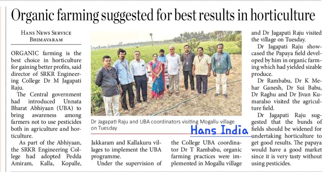 SRKR Engineering College Director Dr. M Jagapati Raju emphasized the benefits of organic farming in horticulture, stating it as the best choice for gaining better profits. The college, as part of the Unnata Bharat Abhiyaan (UBA) program, adopted several villages to implement organic farming practices. Under the supervision of College UBA coordinator Dr. T Rambabu, a papaya field was developed in Mogallu village using organic farming methods, yielding sizable produce. Dr. Raju suggested widening the bunds of fields for better results in horticulture and highlighted the market potential of organic papaya due to its taste and lack of pesticides.