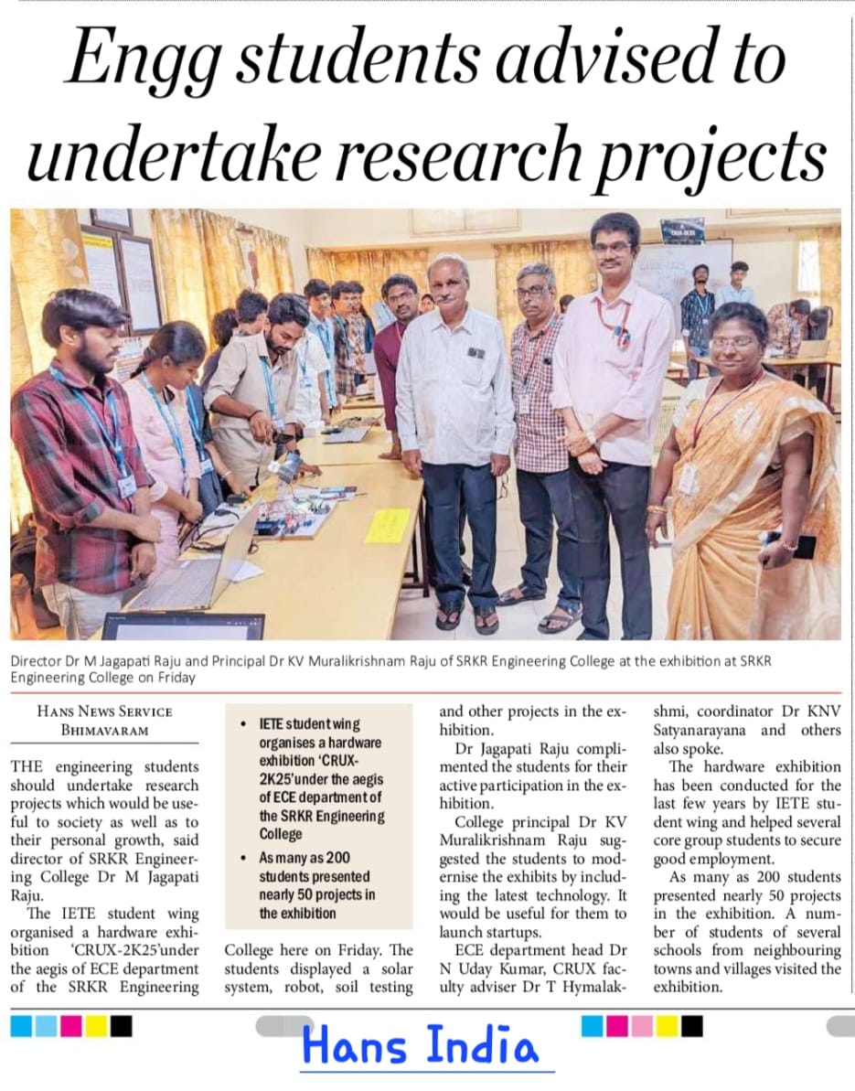 The SRKR Engineering College's IETE student wing recently organized a hardware exhibition titled 'CRUX-2K25' under the aegis of the ECE department. The event featured around 50 projects presented by approximately 200 students, showcasing innovative technologies such as solar systems, robots, and soil testing equipment. The exhibition was attended by students from neighboring schools and villages, providing them with valuable exposure to cutting-edge technology. The event was inaugurated by Director Dr. M Jagapati Raju and Principal Dr. KV Muralikrishnam Raju, who encouraged students to undertake research projects that could benefit society and enhance their personal growth. The exhibition has been a recurring event for the past few years, helping students secure good employment opportunities.