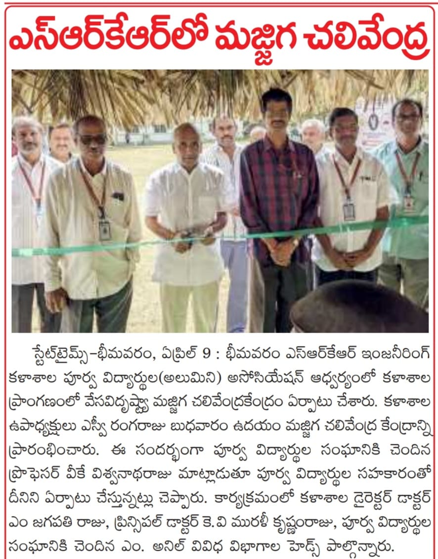 To provide refreshing relief to students during the hot summer months, SRKR Engineering College inaugurated a Buttermilk Distribution Centre (మజ్జిగ చలివేంద్ర) on campus. The initiative, part of the NSS (National Service Scheme) activities, was formally launched by Vice Principal Prof. S.V. Rangaraju, with several faculty members and students in attendance. The project aims to serve students during summer events and examinations, offering them hydration and care. College Principal Dr. K.V. Muralikrishnamraju, Director Dr. M. Jagapathi Raju, and NSS Coordinator M. Appireddy appreciated the efforts and emphasized the importance of student well-being and community service through such thoughtful initiatives.