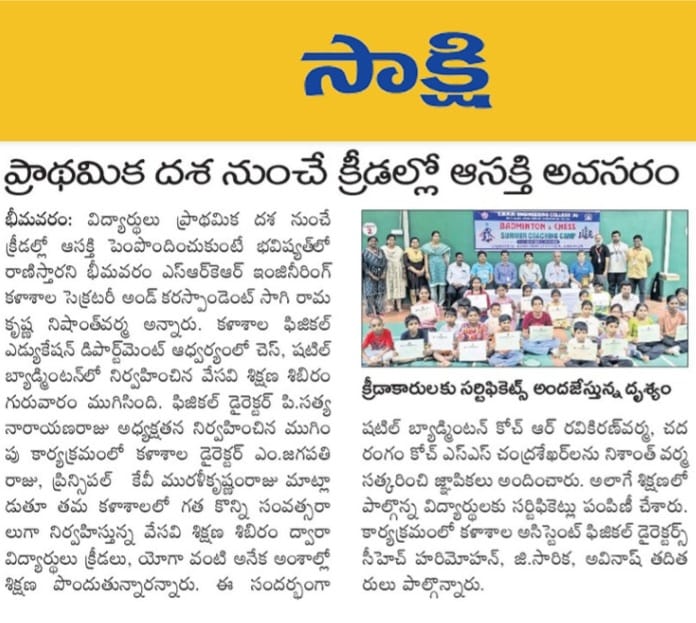 SRKR Engineering College recently organized a Summer Sports Camp to encourage children to engage in physical activity from a young age. The camp, held at the Indoor Stadium of SRKR, was inaugurated by Physical Education Director Mr. Sai Kumar. The initiative focused on training children in badminton and chess, aiming to boost their physical and mental well-being.