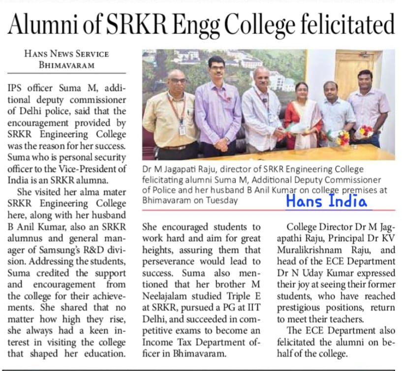 SRKR Engineering College felicitated alumna Ms. Suma M, IPS officer and Additional Deputy Commissioner of Delhi Police, during her visit to the campus with her husband Mr. B Anil Kumar, General Manager at Samsung R&D and also an SRKR alumnus.