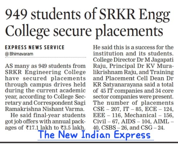 College Director Dr. M Jagapati Raju, Principal Dr. KV Muralikrishnam Raju, and the placement cell expressed their joy over this achievement and appreciated the hard work of students, faculty, and training teams.This record placement once again proves SRKR’s reputation as a premier institution producing skilled and employable engineers.