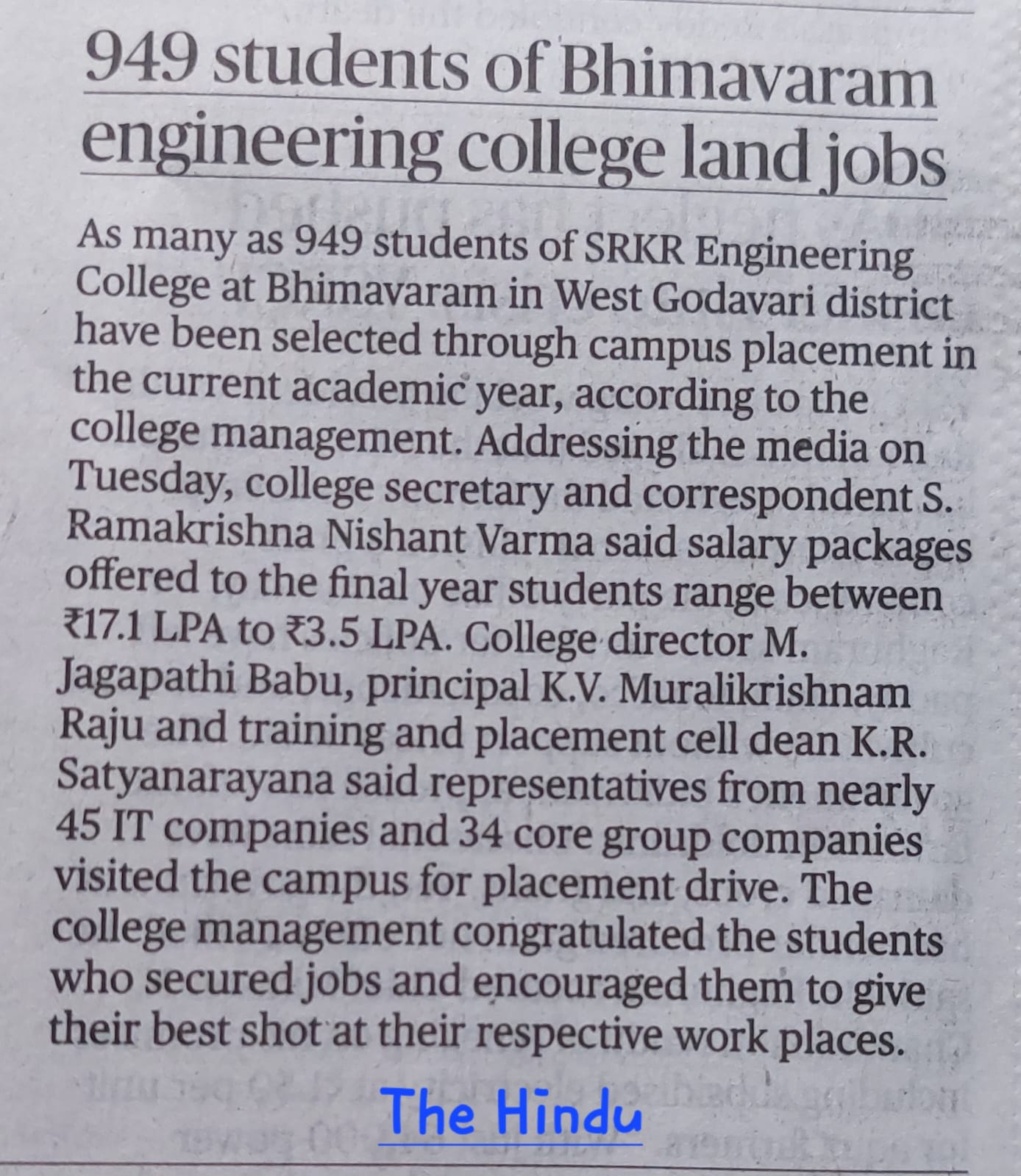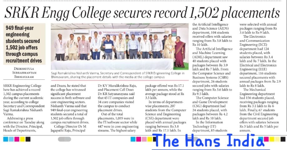 SRKR Engineering College has achieved a remarkable milestone by securing 1,502 job offers for 949 final-year students during the current academic year's placement drives.