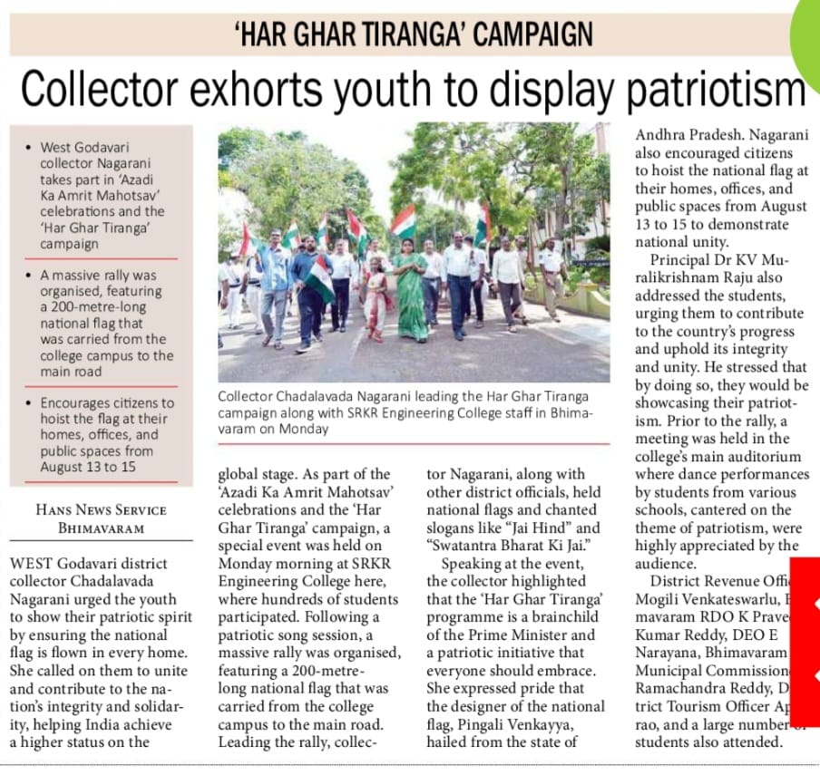 As part of the 'Azadi Ka Amrit Mahotsav' celebrations and the 'Har Ghar Tiranga' campaign, a special event was held on Monday morning at SRKR Engineering College here, where hundreds of students participated. Following a patriotic song session, a massive rally was organised, featuring a 200-metre-long national flag that was carried from the college campus to the main road. Leading the rally, collector Nagarani, along with other district officials, held national flags and chanted slogans like "Jai Hind" and "Swatantra Bharat Ki Jai."