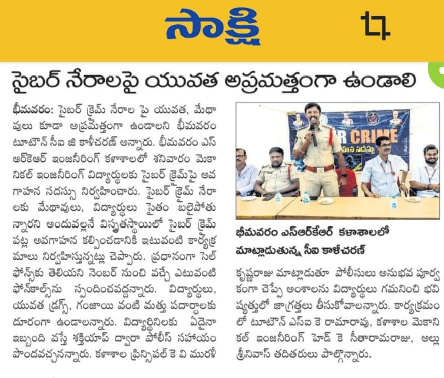 Bhimavaram Two-Town CI G. Kali Charan said that youth and intellectuals should also be alert about cyber crimes. An awareness seminar on cyber crime was conducted for mechanical engineering students at Bhimavaram SRKR Engineering College on Saturday.
