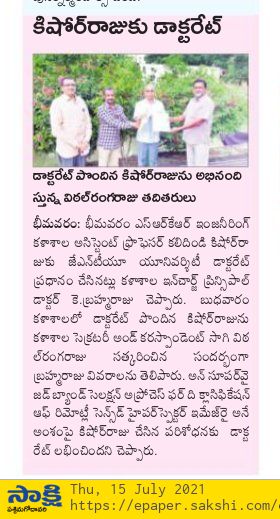 Kalidindi Kishore Raju, Assistant Professor of IT Department has been awarded with PhD from JNTU Kakinada for his thesis titled "Unsupervised Band Selection Approaches for the classification of remotely sensed hyperspectral images"