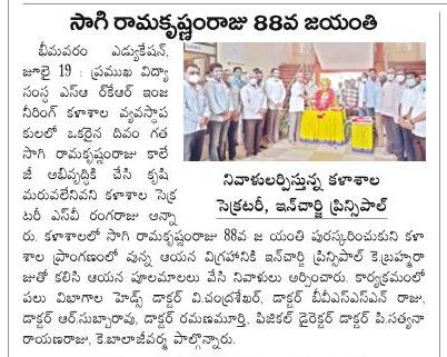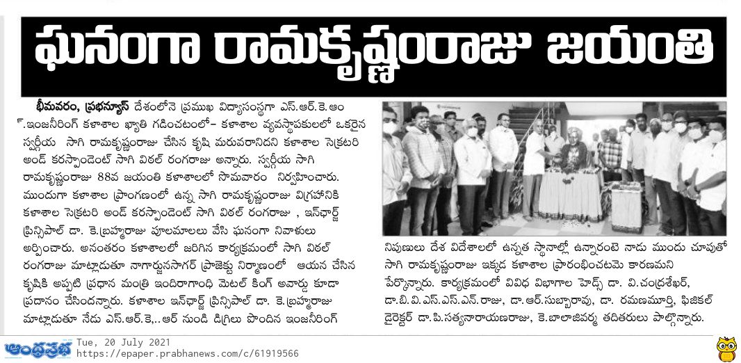 88th Birth Anniversary Celebrations of SRKREC founder Sri. Sagi Rama Krishnam Raju garu has been celebrated on 19th July 2021 in the campus. Secretary & Correspondent Sri S.V. Rangaraju garu, Incharge Principal Dr. K. Brahmaraju garu paid homage by offering flowers to the statue of Sri. Sagi Rama Krishnam Raju garu. Heads of the departments, faculty and staff were present on the occasion.