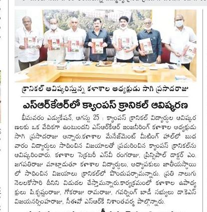 The campus magazine of SRKREC named Campus Chronicle has been launched officially by the college management here on campus. The Campus Chronicle magazine will publish all the achievements, activities and happenings of the campus every 4 months. The college committee President Sri Sagi Prasada Raju garu, Vice Presidents Sri P Krishnam Raju garu, Sri Gokaraju Ramaraju garu, Secretary & Correspondent Sri S.V. Rangaraju garu, Governing Body Member Dr. K.S. Vijaya Narasimha Raju garu, CEO Sri S.R.K. Nishant garu, Principal Dr. Jagapathi Raju garu, and others were present on this occasion.