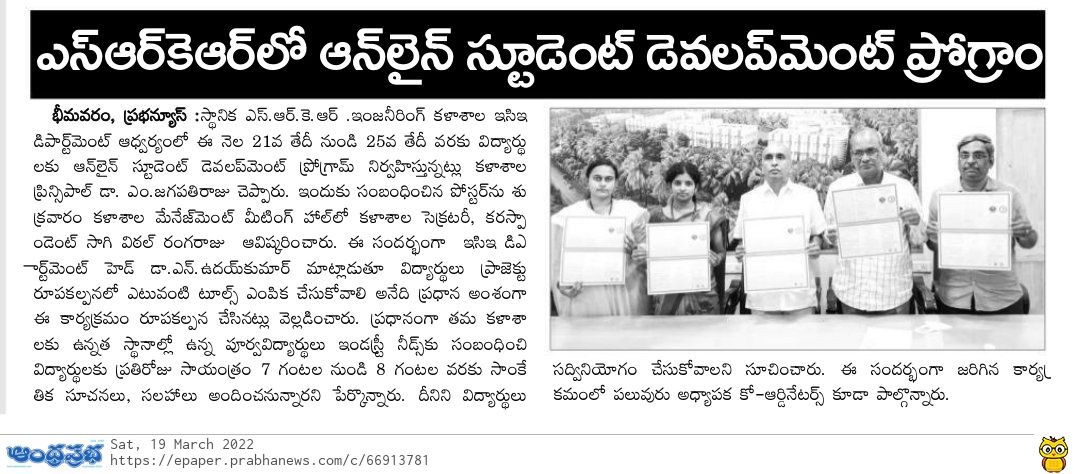 The Dept of ECE at SRKR Engineering College was conducting a one week Online Student Development Programme on "EXPOSURE ON FUNDAMENTALS AND TOOLS USAGE FOR PROJECT IMPLEMENTATION" from 21st March to 25th March, 2022. The poster relating to the same was inaugurated by the Secretary and Correspondent of SRKR Engg College, Sri. S. Vital Ranga Raju garu. This programme was aimed at enlightening the students on various tools that can be used during their project evaluation. The alumni of the college who are in prominent positions in the industry will enlighten the students everyday from 7PM to 8PM as a part of this programme. The Principal of SRKR Engg College Dr. M. Jagapathi Raju and the HOD of ECE Dept Dr. N. Uday Kumar urged the students to make use of this enriching sessions which will provide a platform for the students to equip the latest skills and knowledge through which they can enhance their knowledge.