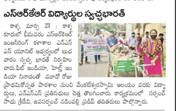 The students of SRKR Engineering College had held a SWACHBHARAT campaign at Kallakuru village as a part of the NSS camp and created awareness to the villagers on this noble initiative. This campaign was held with the aim of 'FIT INDIA-HEALTH INDIA' from ZP High School to Lord Venkateswara Swamy temple. NSS Faculty Coordinators along with the Sarpanch and Vice-Sarpanch of the village had participated in this programme.