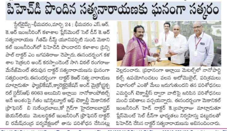 The Dean Placements of SRKR Engg College Mr. KR Satyanarayana had received the Doctorate from GITAM University in the stream of Mechanical Engineering. He had done his research on the topic of 'Fabrication and Characterization and Micro structural Studies of 6063 Alumini Alloy Nano Composites'. His research would be adding value to the sectors of Automobiles and Industry. The Secretary and Correspondent of SRKR Engineering College Sri. S. Vital Ranga Raju garu, Principal Dr. M. Jagapathi Raju garu, HOD of Mechanical Dept Dr. Brahma Raju garu and other faculty members felicitated Dr. Satyanarayana and wished him all the best for his future endeavors.