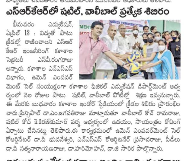 The Physical Education Department at SRKR Engg College in collaboration with NSS Unit and Women Empowerment Cell is conducting Sports Camp in Shuttle and Volley Ball for one month. This camp was being inaugurated by the Secretary and Correspondent of SRKR Engineering College Sri. SV Ranga Raju garu on 13th April at the indoor stadium of the college. Speaking on this occasion Sri SV Ranga Raju garu urged the students to give prime importance to sports too along with the academics which will play a vital role in the all round development of the students. Principal of SRKR Engineering College Dr. M. Jagapathi Raju garu had said that the students in this camp will be trained by the Volleyball Coach Mr. Ramaraju and Shuttle coach Dr. KKK Varma for a period of one month at morning and evening times. Women Empowerment Cell Coordinator Dr. P. Bhuvaneshwari, NSS Unit Coordinator Prasadraju, Physical Education Dept staff members Dr. P. Satyanarayana Raju, Dr. Harimohan and Dr. G. Sarika took part in this occasion.