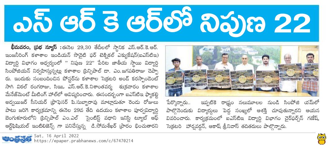 ISTE (Indian Society for Technical Education) student chapter is conducting two day national level student symposium NIPUNA-22 at SRKR Engineering College on 29 th and 30 th of this month. A poster of this event is being inaugurated at the college by CEO Sri. SRK Nishanth Varma Garu, Secretary & Correspondent Sri. SV Ranga Raju garu and Principal Dr. M. Jagapathi Raju garu. Speaking on this occasion ISTE Faculty Advisor and Senior Professor P. Subbarao has said that this event would be inaugurated on 29 th April by prominent alumni of the college, D. Somsekhar, Principal ML Scientist at Wadhwani Institute of AI, Bangalore. There was a huge response from student community around the state to participate in this event. ISTE Student Division Chairperson Ganesh, Secretary Harshavardhan, Akash Srinivas had participated in this programme.