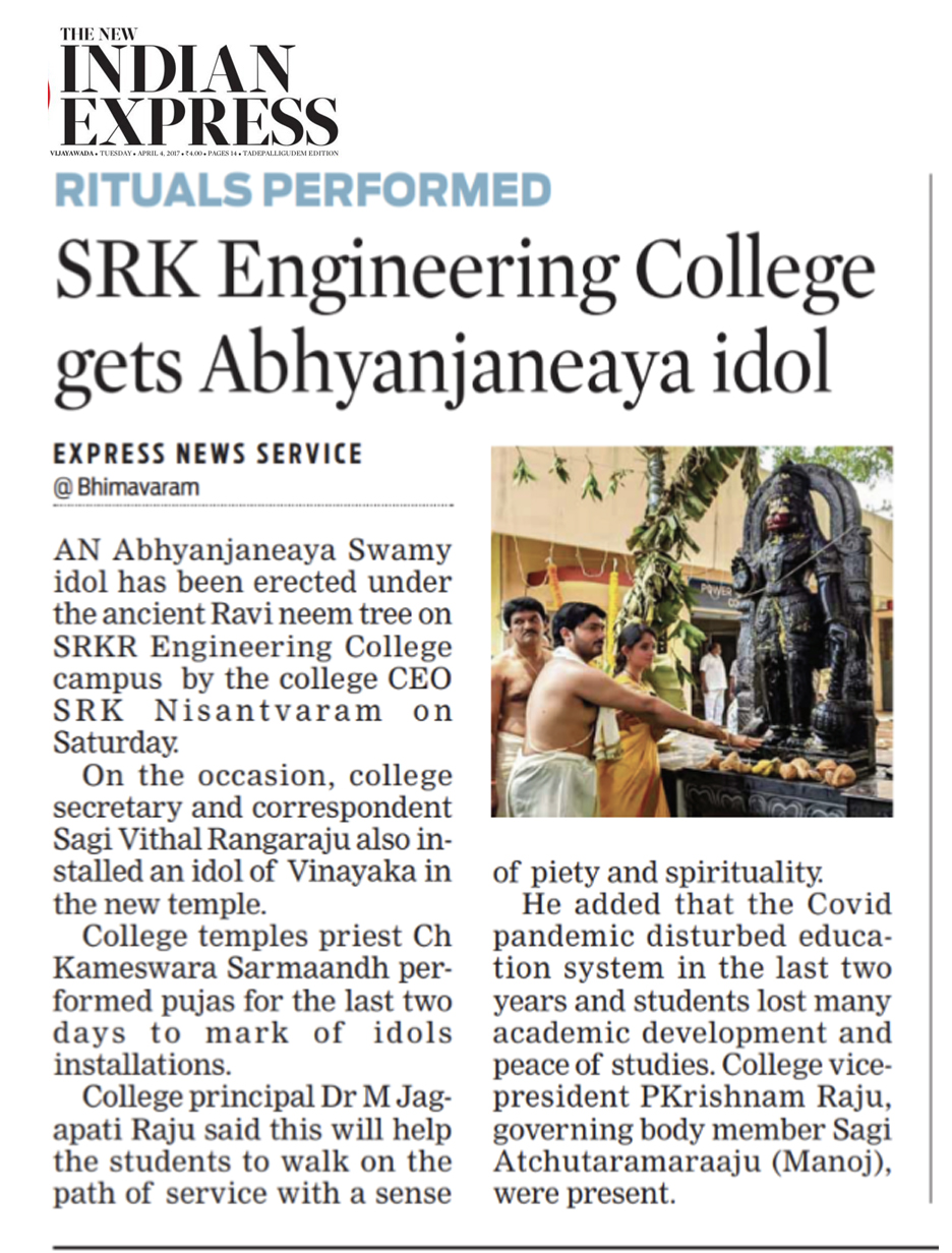 The idol of Lord Abhaya Anjaneya Swamy had been installed at the SRKR Campus by CEO Sri. SRK Nishanth Varma garu along with his wife and Lord Vinayaka idol had been reinstalled by Secretary and Correspondent Sri. SV Ranga Raju garu along with his wife in a traditional and spiritual environment on 16 th and 17 th of April, 2022 under the supervision of the priests Sri. Ch. Kameswara Sharma and his team. Principal Dr. M. Jagapathi Raju garu had said that it was a great gesture from the management to install the idols at the campus and urged the students to develop a sense of spirituality which will lead them towards success with confidence. He said that with the blessings of the almighty the pandemic should end shortly and wished that students should march ahead in the path of success. College Vice President Sri. P. Krishnam Raju garu, Governing Body Member Sagi Achutaramaraju Garu along with the HODs, Teaching, Non-Teaching staff and students participated in these rituals.