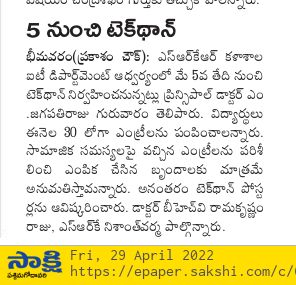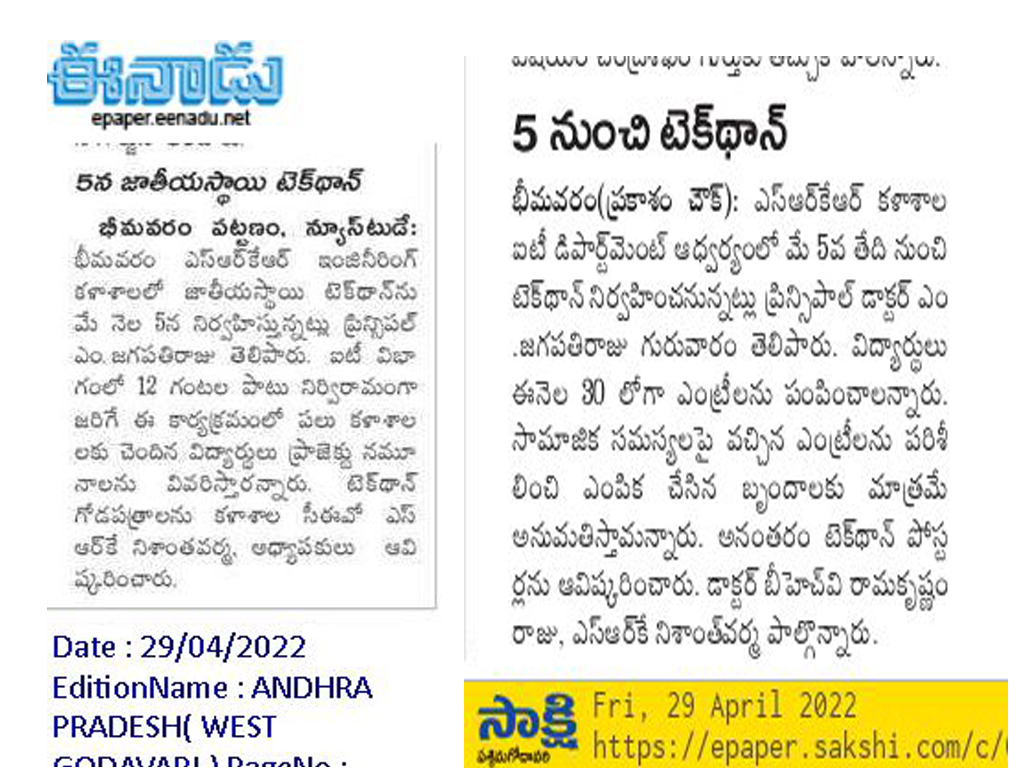 IT Dept of SRKR Engg College is conducting 12 hours hackathon named TECHTHON on 5th May, 2022, Principal Dr. M. Jagapathi Raju garu had said. IT Dept HOD Dr. BHV Ramakrishnam Raju had said that interested students should send their concepts by 30th of April, 2022. After scrutinizing the ideas, the shortlisted students would only be allowed to participate in this event. Students from any engineering stream can participate in this event. SRKR CEO Sri. SRK Nishanth Varma had inaugurated the poster of TECHATHON. Departments of IT, CSBS and AIDS in collaboration with Computer Society of India Student Chapter are going to organize Two Day National Level Symposium TECHFLEET 2K22 on May 7th and 8th. IT HOD Dr. BHV Ramakrishnam Raju is the Coordinator of this event and Dr. I. Hemalatha and Dr. K. Kishore Raju would act as Co-Coordinators and S. Jeswanth Sai and K. Bindu Maduri will act as Student Coordinators.